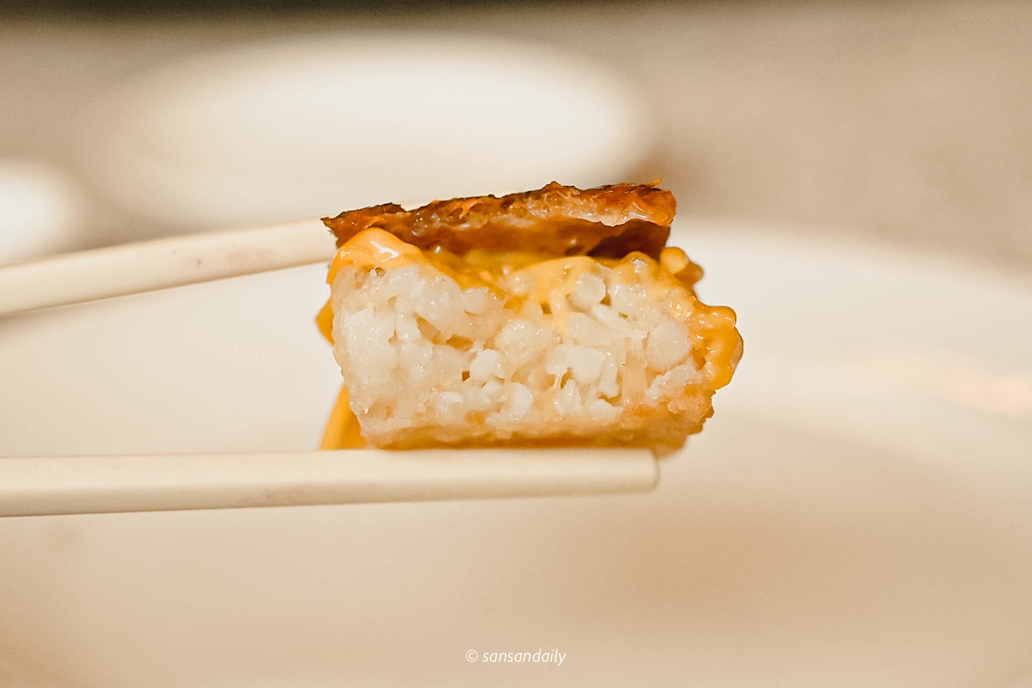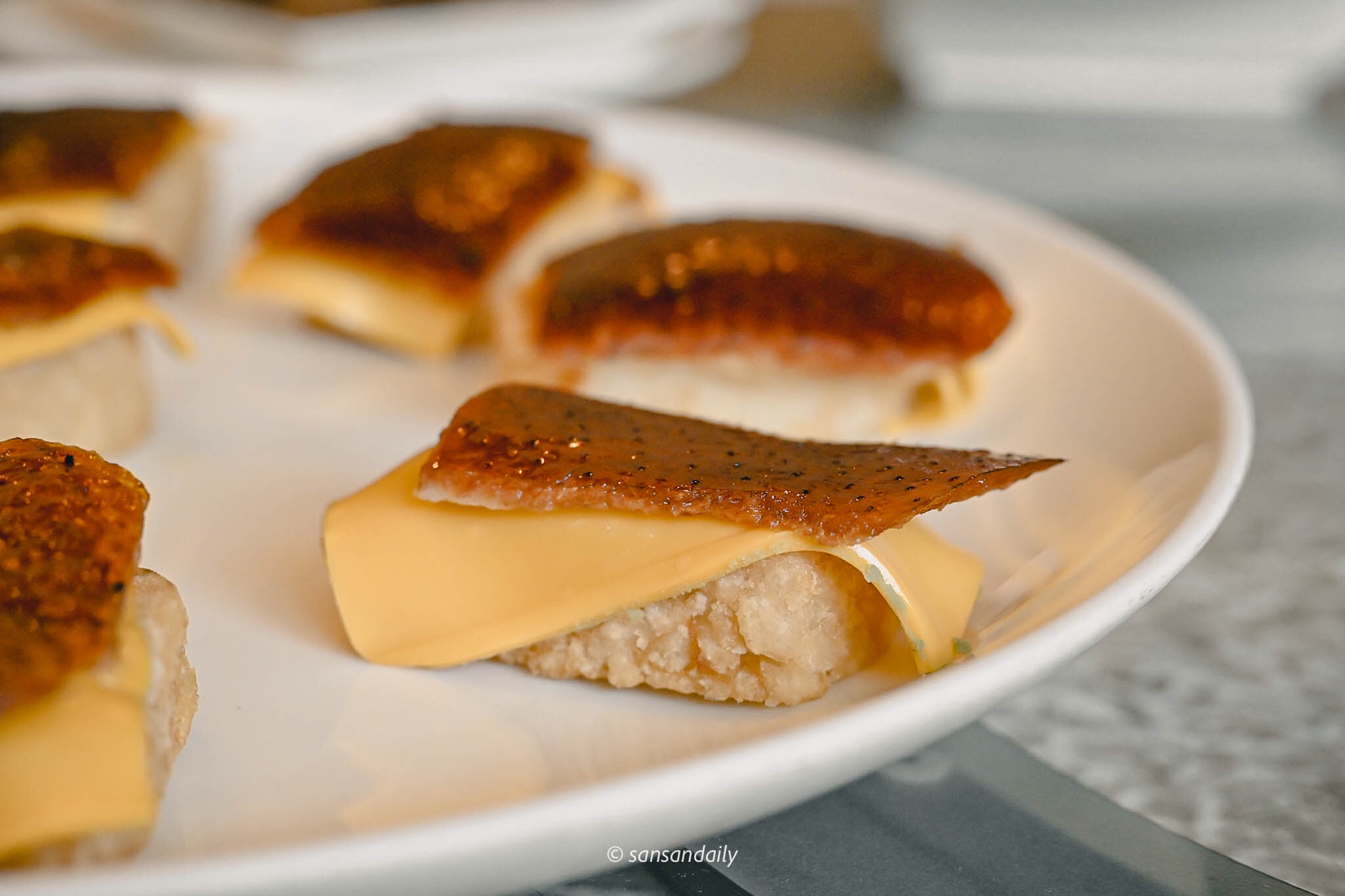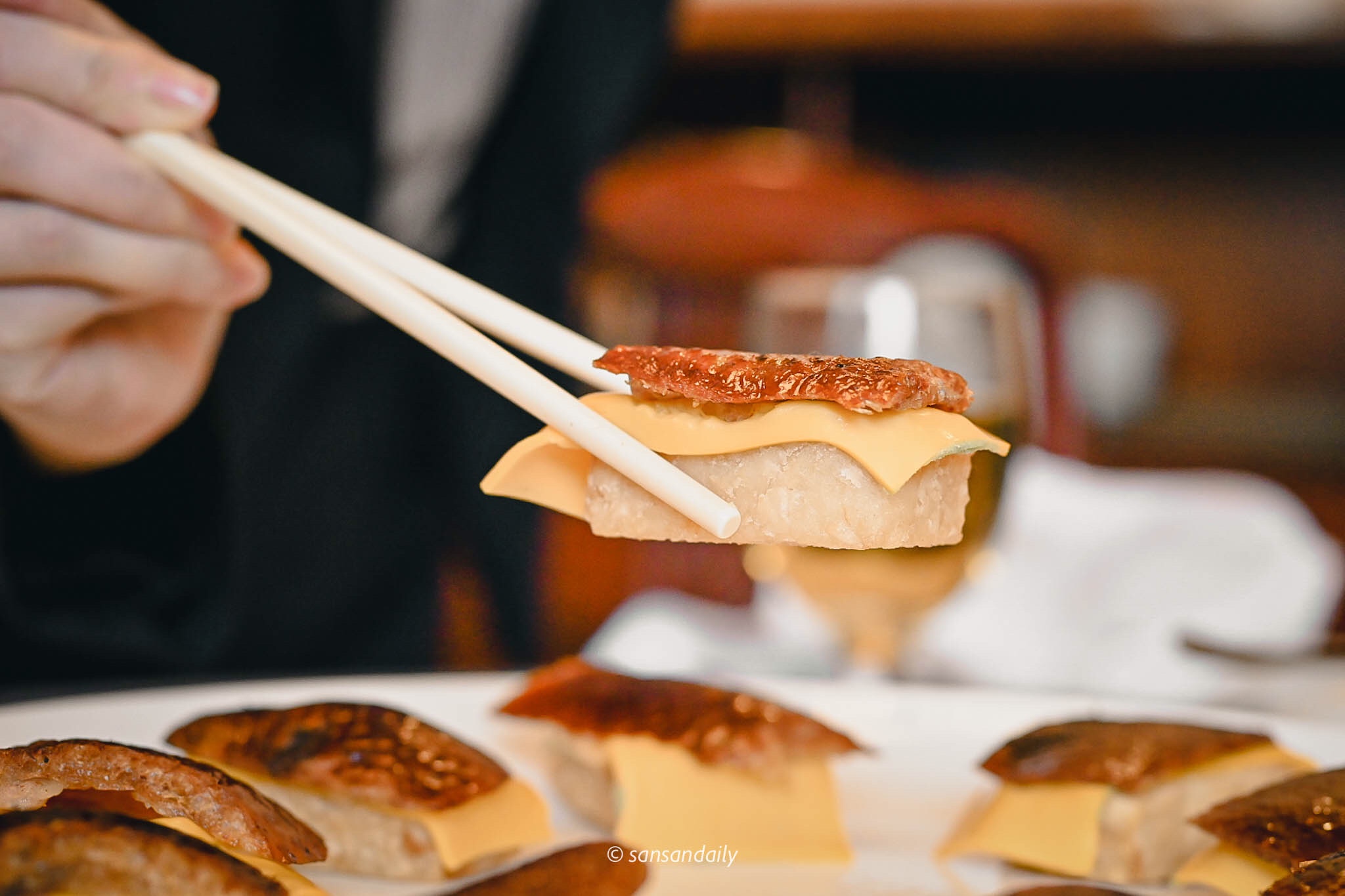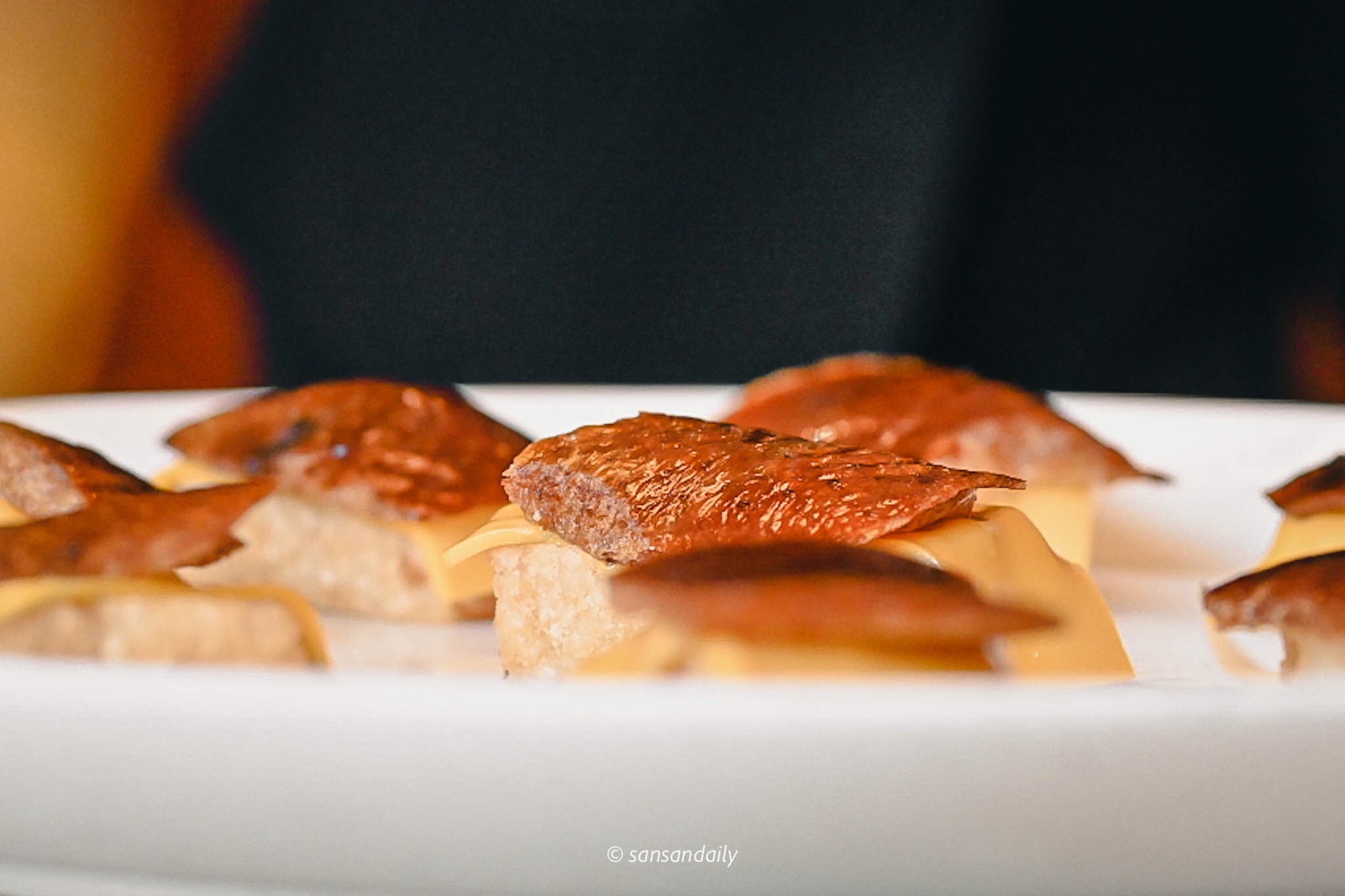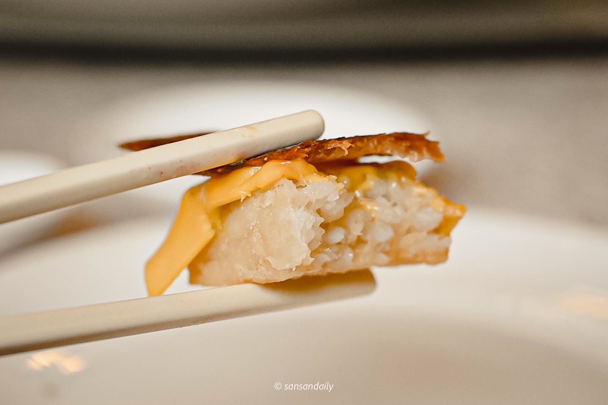 片鴨與起司片覆蓋在滋糕飯上,拌入干貝絲的滋糕飯經過一道手續「炸」,替這道「鴨壽司」帶來不同凡響的創新美味與多層次的迷人口感。