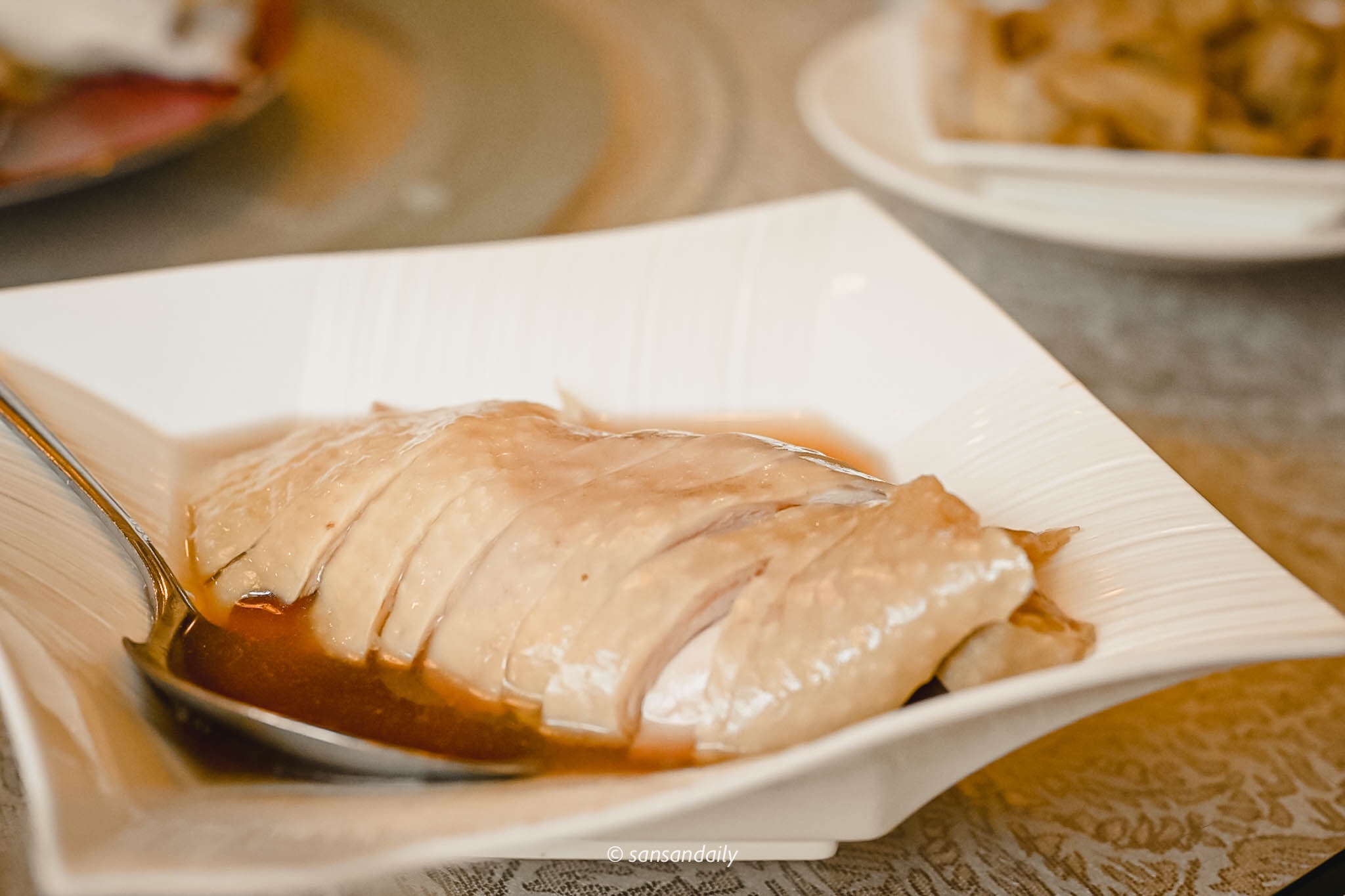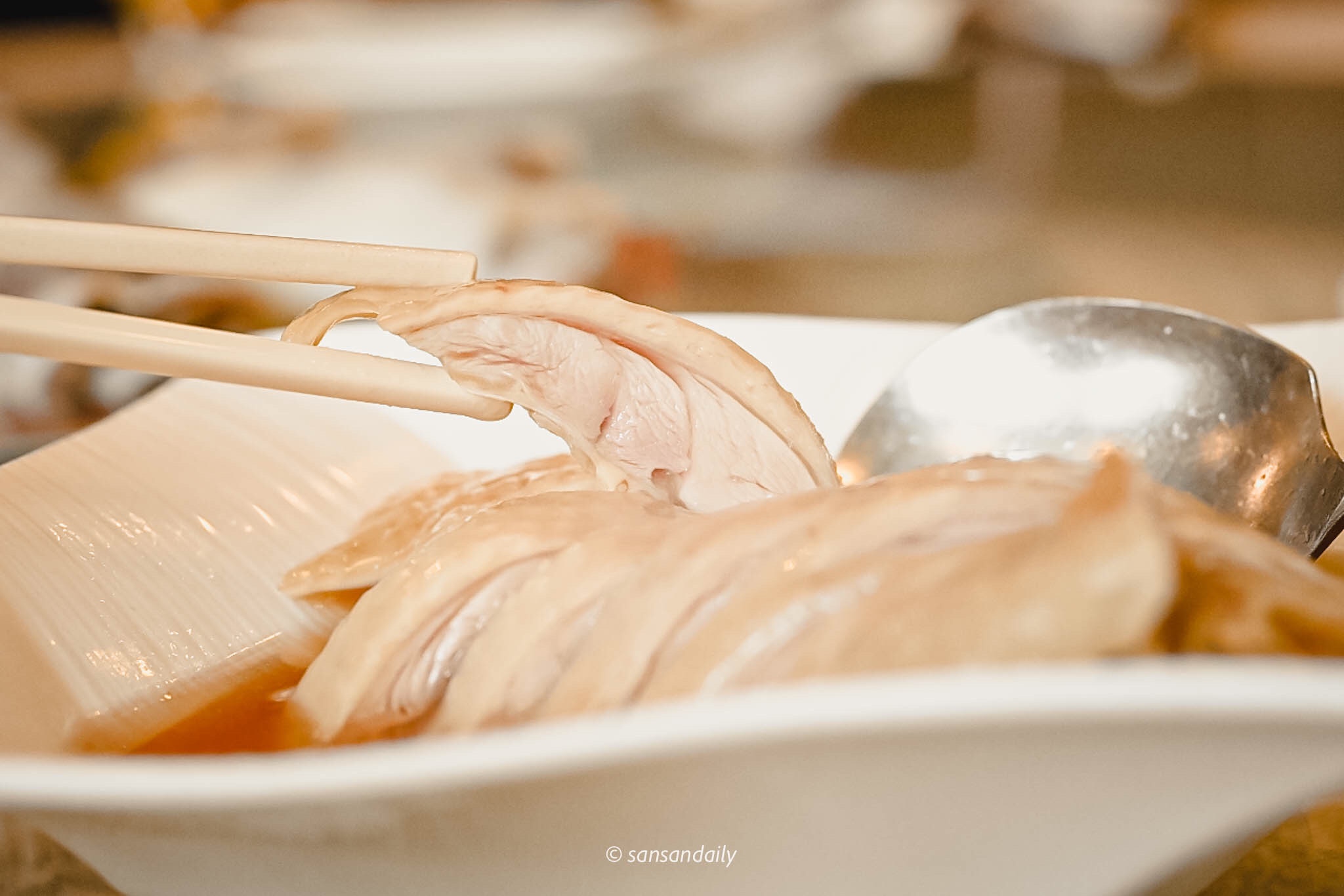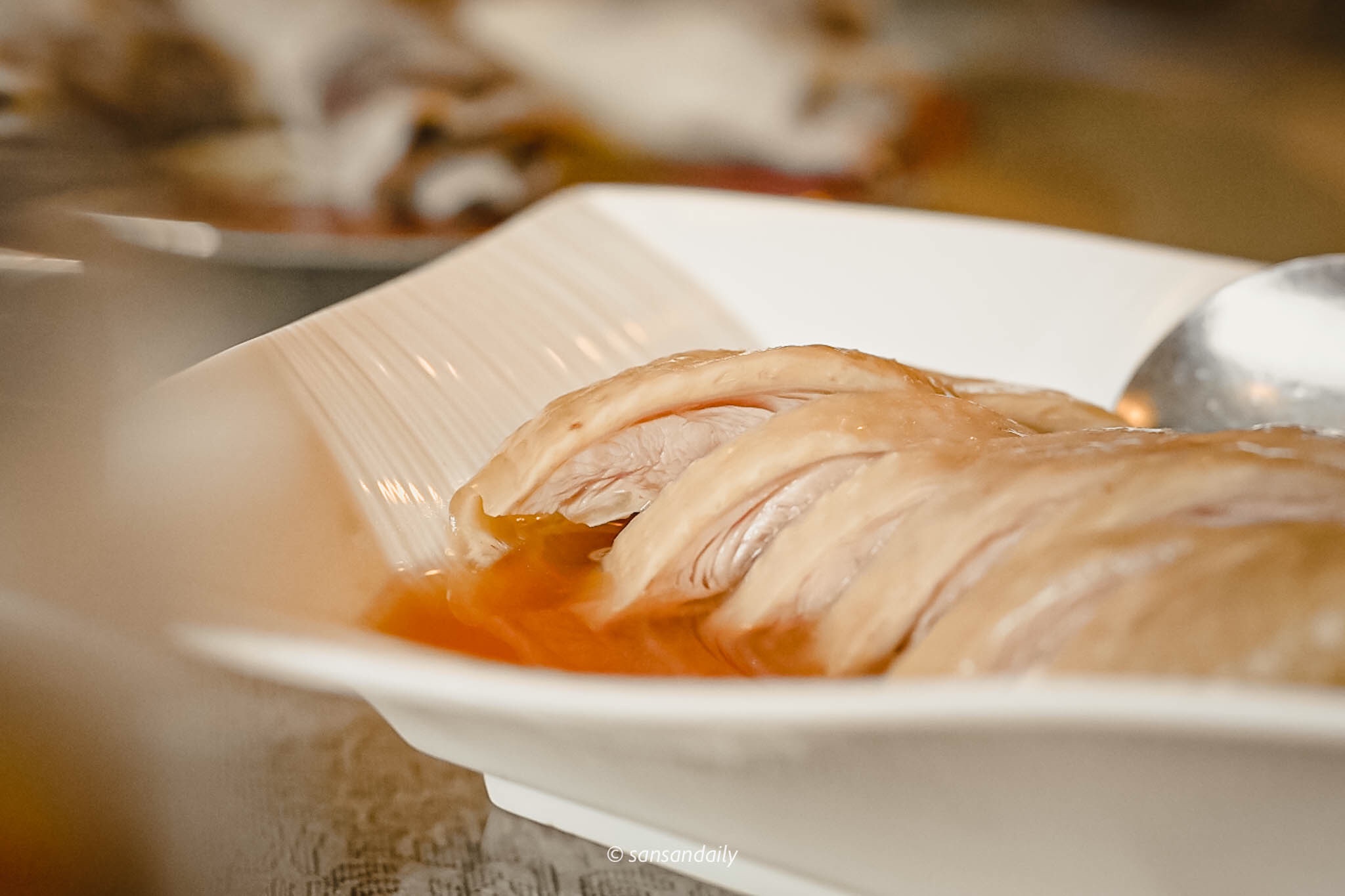江南春招牌菜「紹興醉雞」,帶著光澤油油亮亮的紹興醉雞,看到那層果凍般的膠原蛋白嗎?這就是我從小到大最愛油雞的原因,冰冰涼涼、口感又彈又嫩,超級醉人~算是雞料理中數一數二喜歡的!