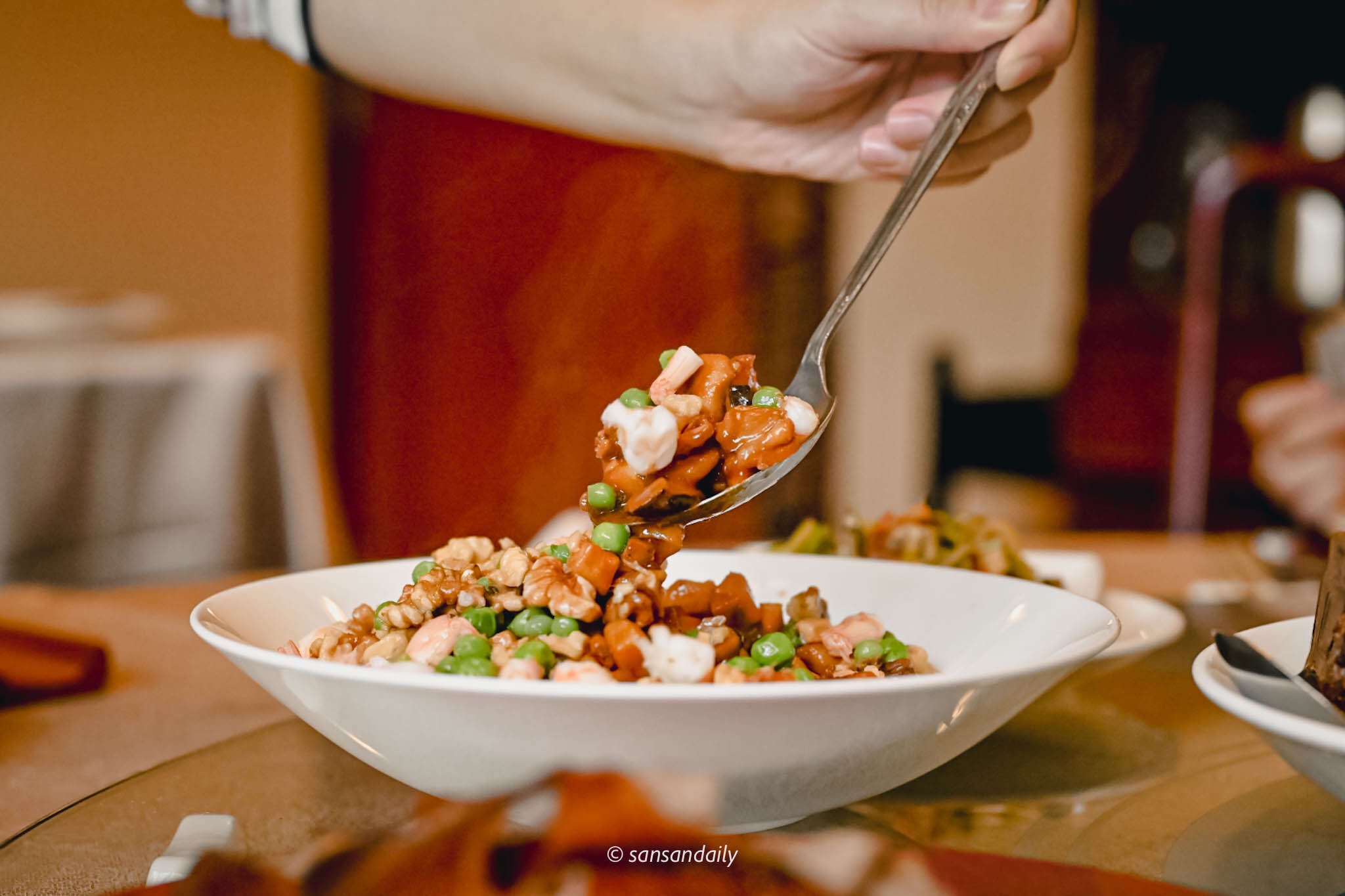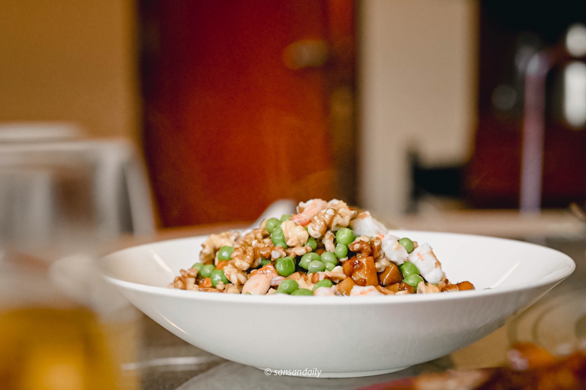 正如開場所說,這道「核桃鬥八鮮」真的是一吃驚艷全場,小小一口中,充滿多層次的香氣與美味。滿滿的美國核桃為基底,以江浙老菜中的八寶辣醬熱鍋快炒蝦仁、豆乾、香菇等食材,八寶辣醬與西洋食材碰撞出全新滋味,帶出堅果的香氣與食材的獨特風味。身為一個核桃控,核桃入菜本就是大愛,但在江南春主廚的手藝下,淋漓盡致發揮核桃與食材的鮮美,端上最完美的一盤秋季佳餚-「核桃鬥八鮮」。