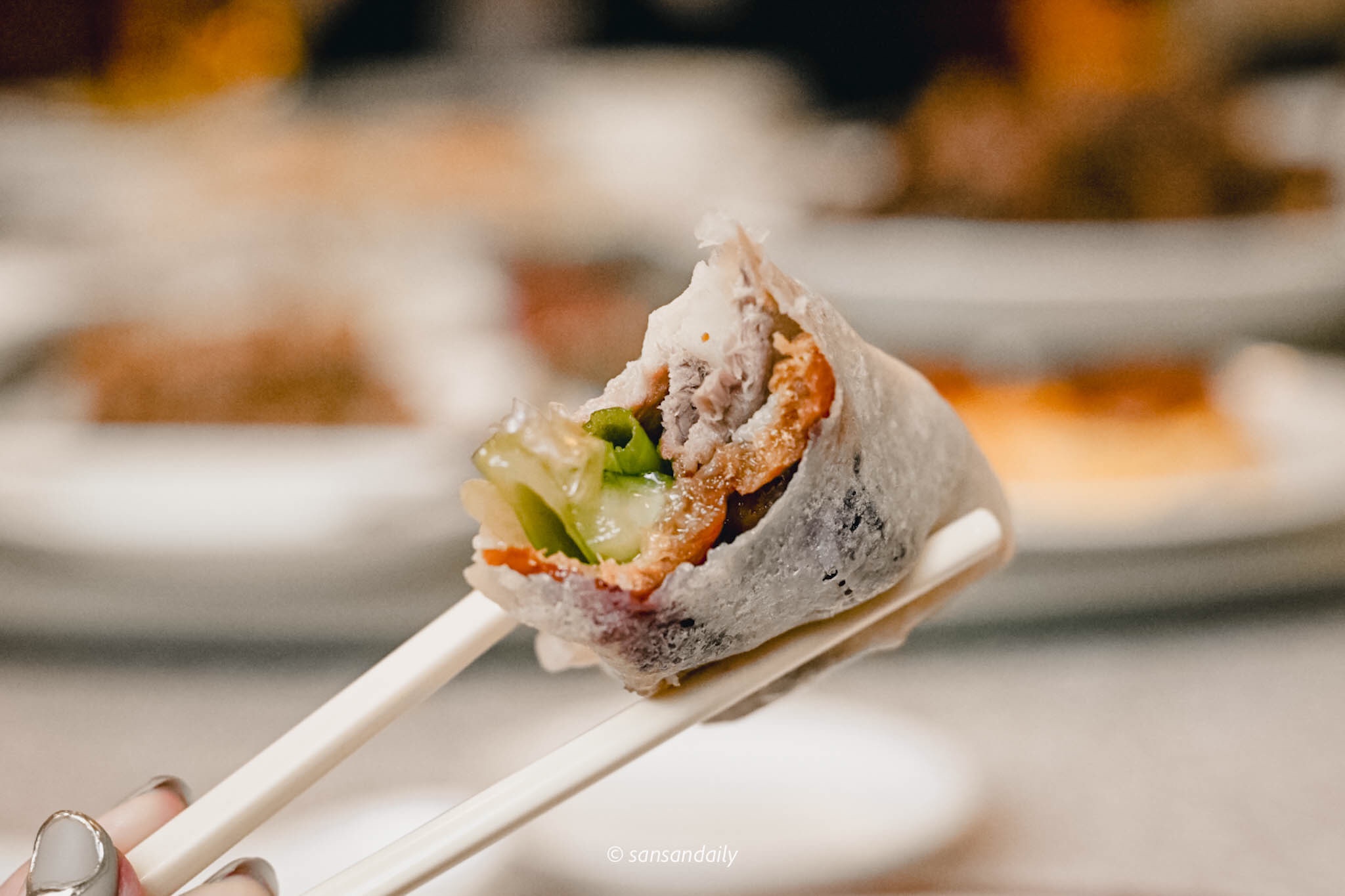 鴨肉捲餅 每一口份量扎實,最先嚐到甜麵醬的甜、鴨皮的酥脆、小黃瓜與大蔥的香氣,接著是鴨肉捲餅主角-軟嫩中帶有鴨油香氣的烤鴨肉。