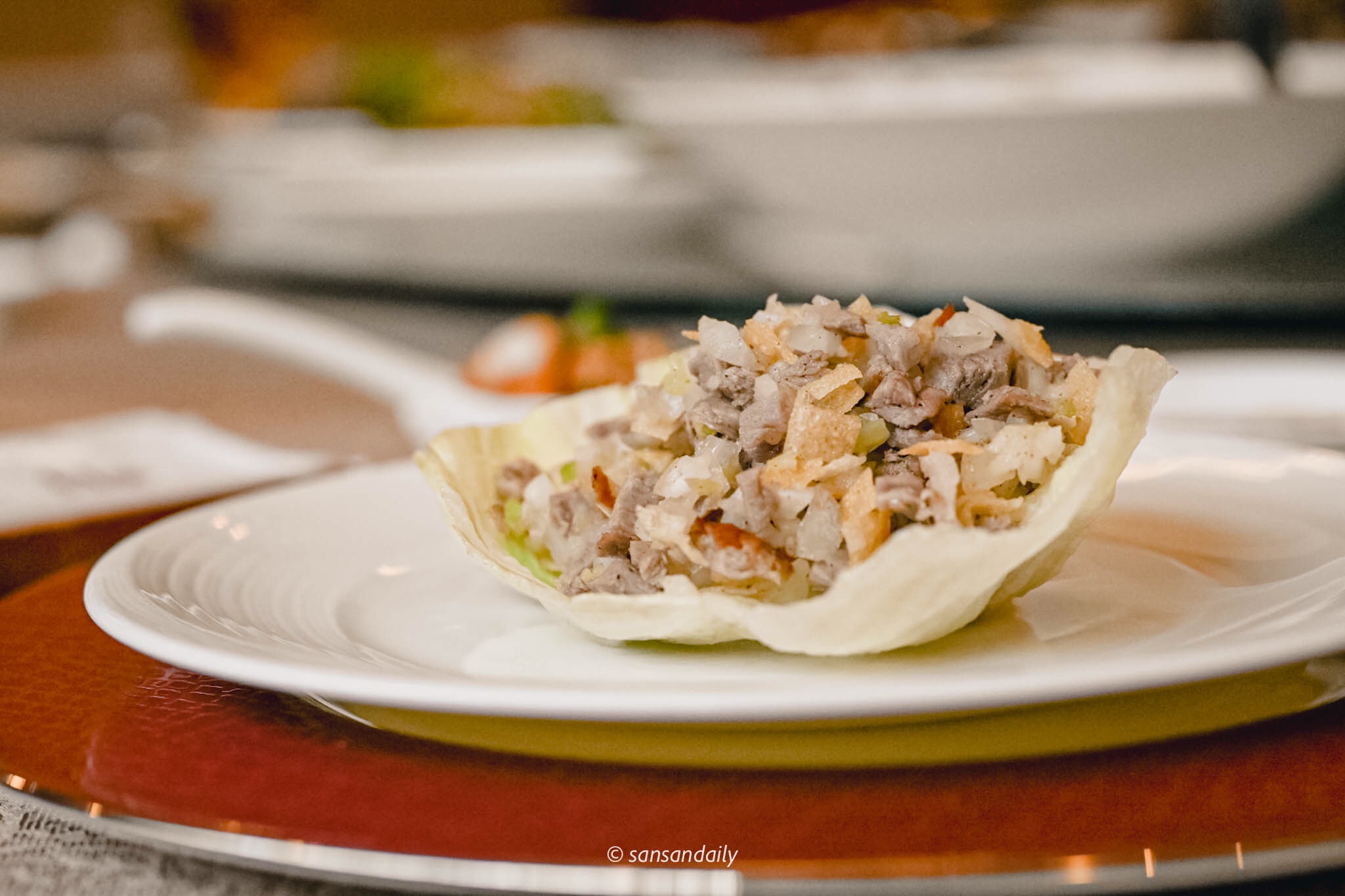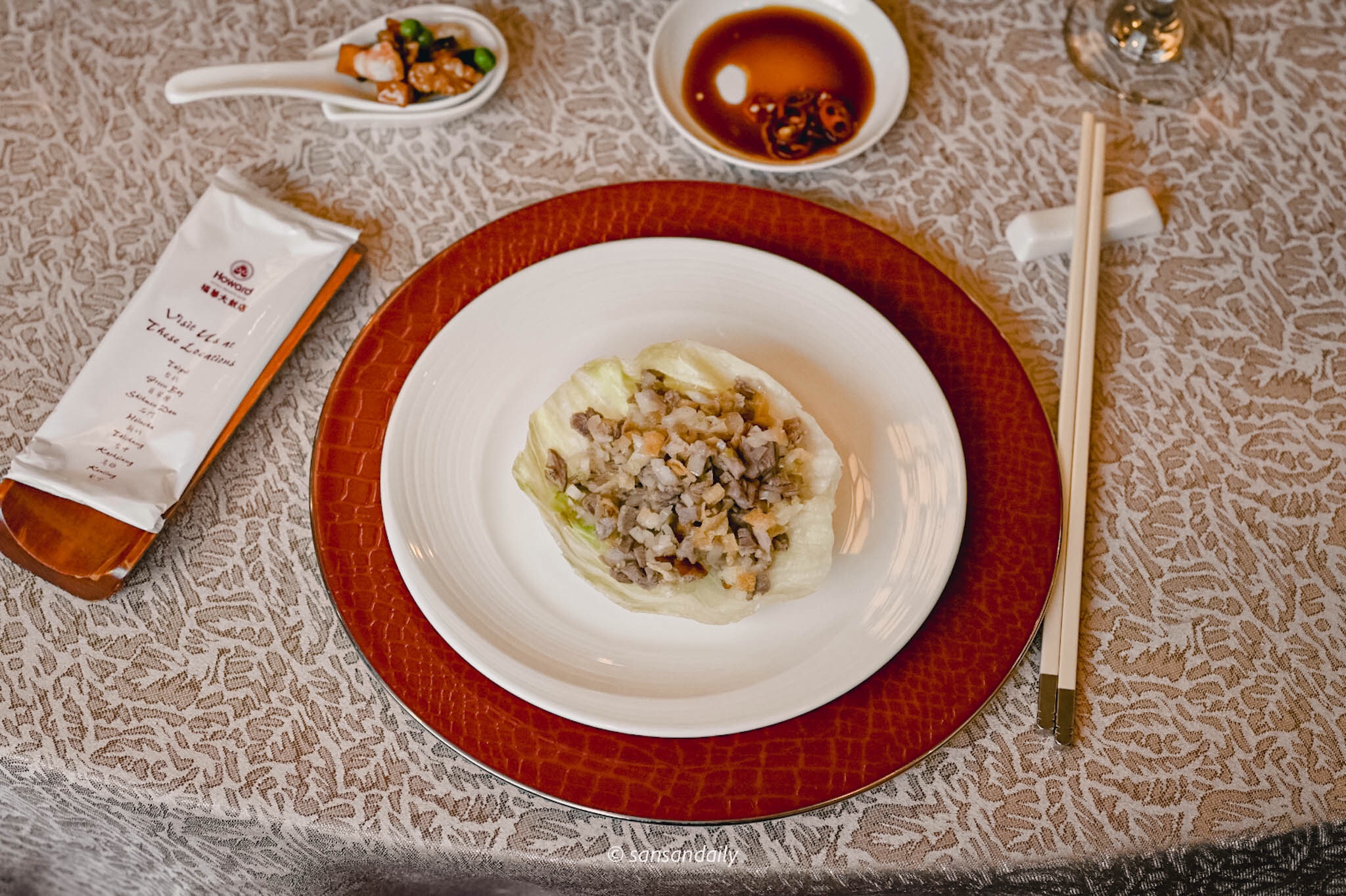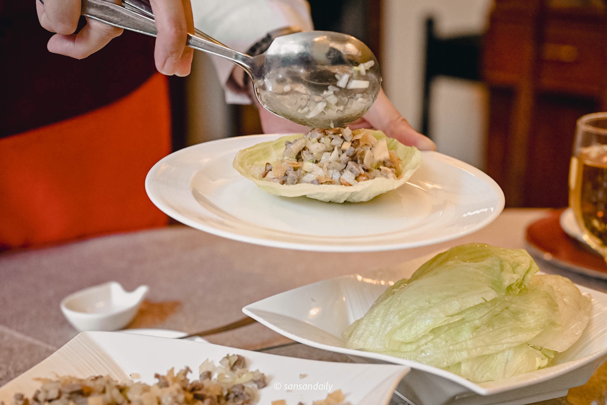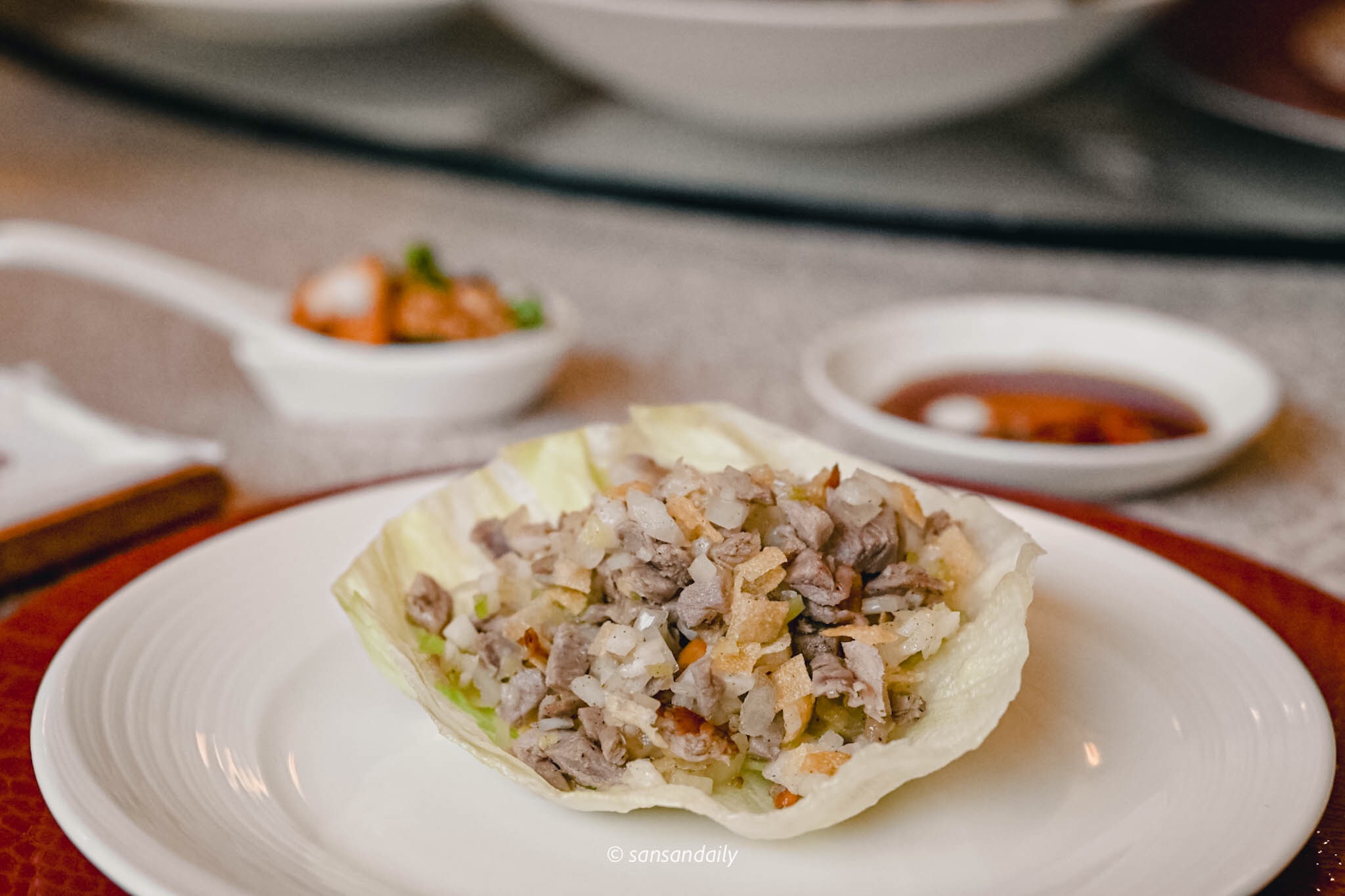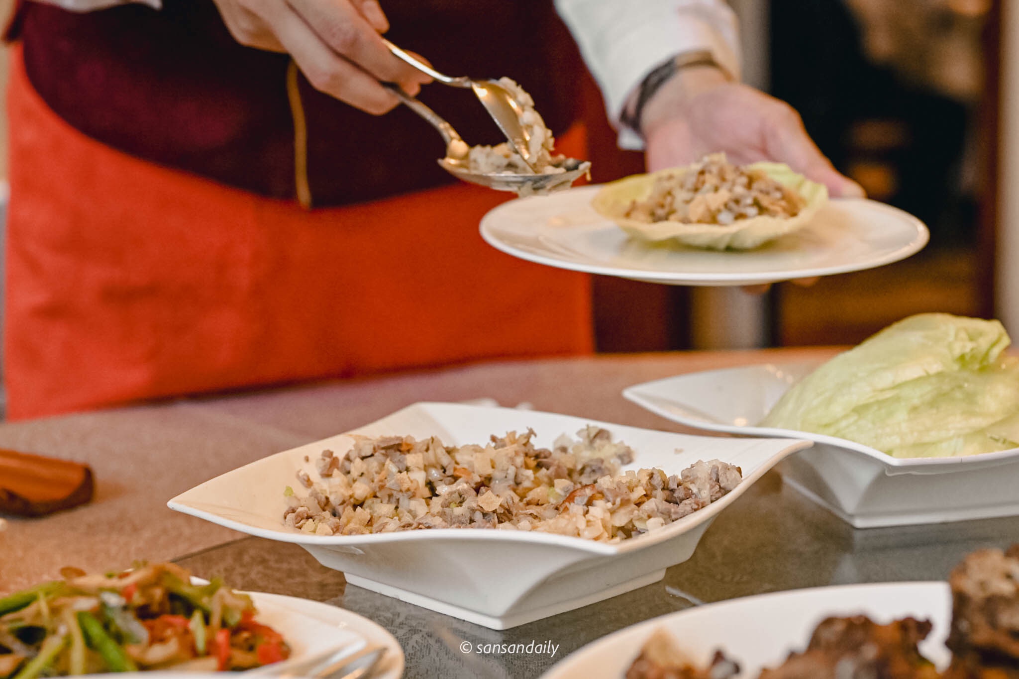 削下鴨骨上的嫩鴨肉丁,拌入酥脆口感的炸餛飩皮與蔬菜丁,搭配新鮮生菜,層次豐富爽脆無負擔。一開始以為會吃不完跟手掌一般大的生菜包鴨鬆,殊不知!一口接一口~清爽的口感意猶未盡