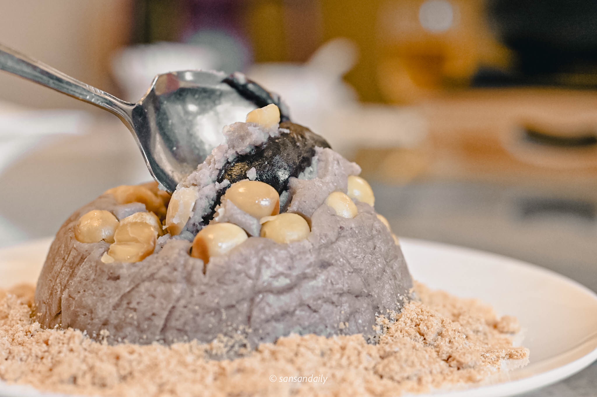 軟糯又帶有一點點QQ口感的芋泥與細緻綿密的豆沙,溫熱的入口迷人充滿誘惑,鼻息間都是花生粉的香氣,忍不住就會想再去挖下一口!