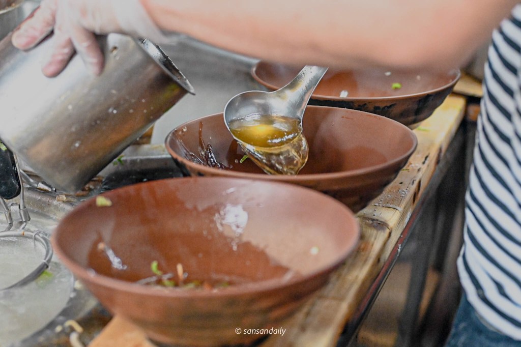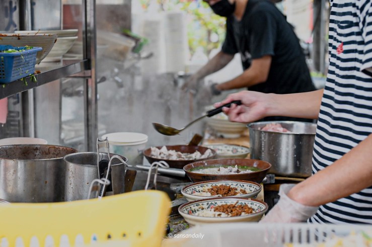 在碗裡放入獨家比例的調味料、起麵、放料、淋上一匙祖傳滷汁,一碗碗乾麵、湯麵快速完成,熱氣還未散去,又開始下一輪煮麵,生意好得不得了。