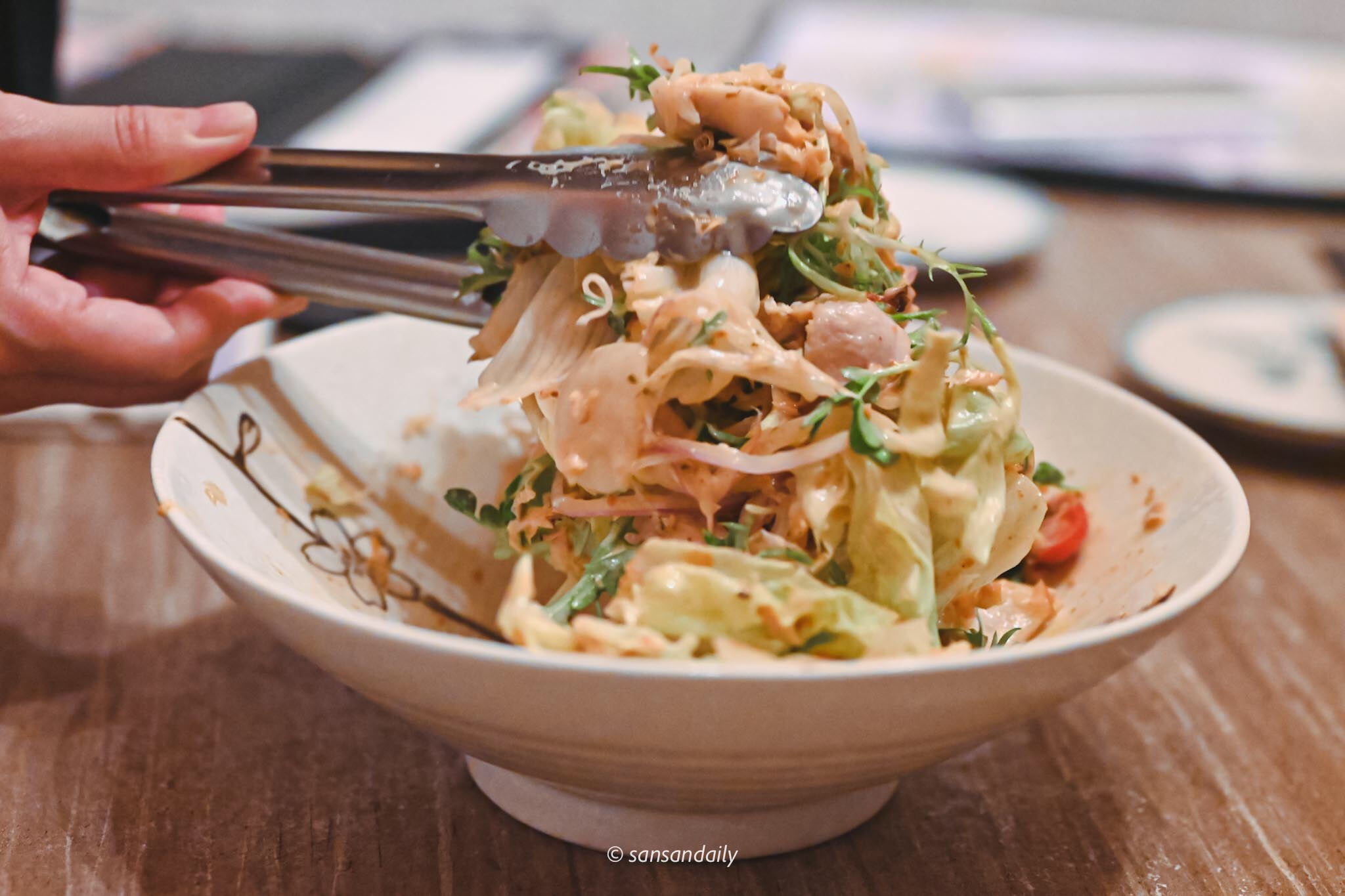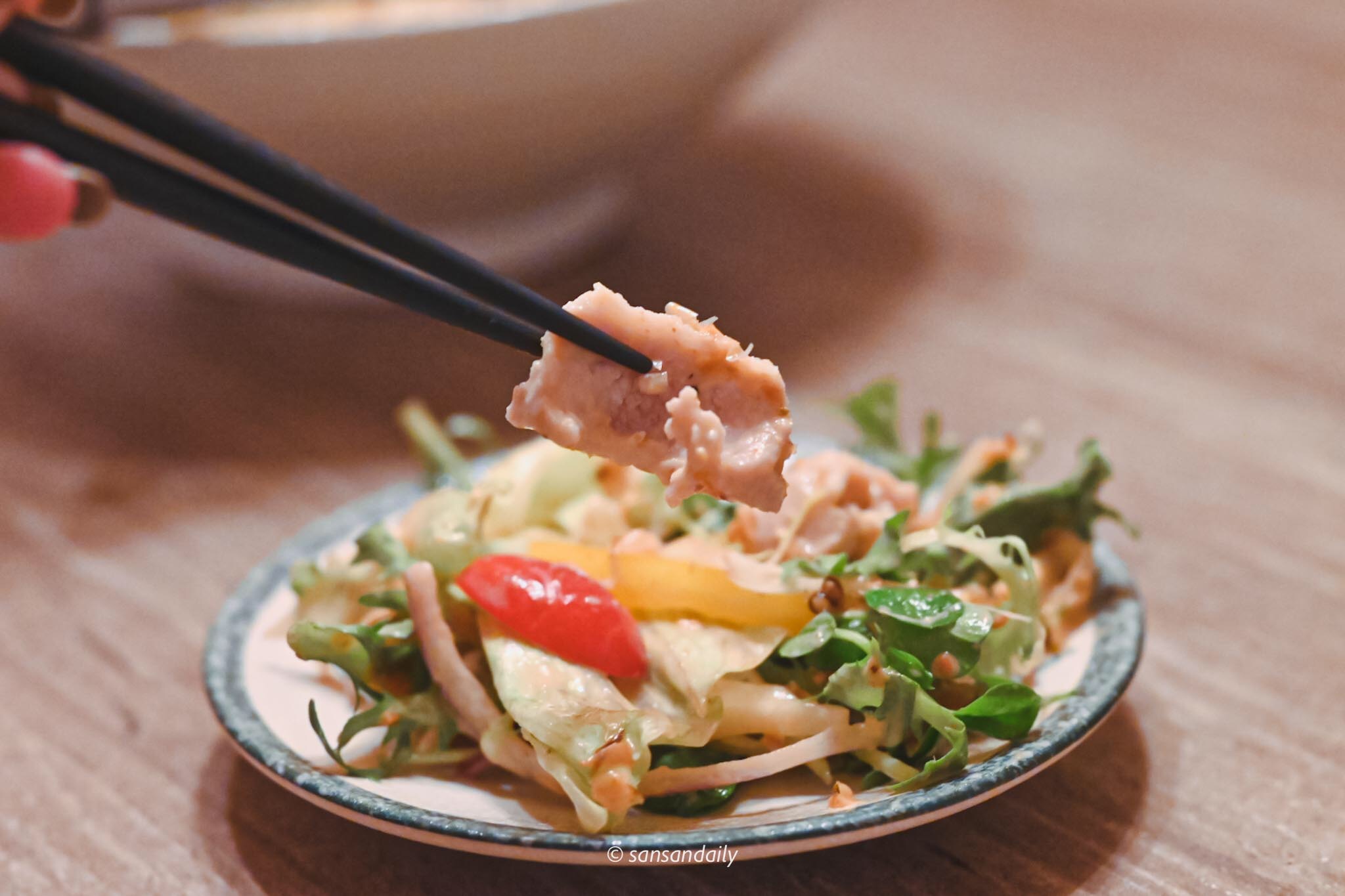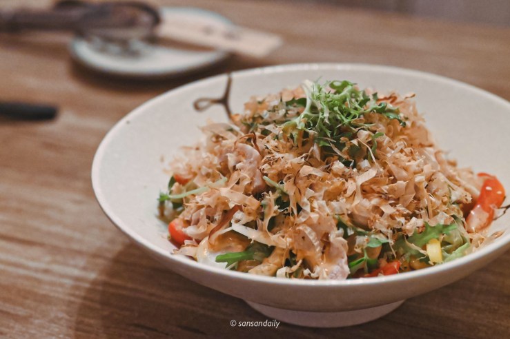 脆口的新鮮沙拉搭配香濃不膩的胡麻醬,在與滿滿的柴魚片拌在一起入口,口感清爽多層次,松阪豬鮮美彈牙。整體來說,他們家的沙拉屬於偏鹹的風味(下酒絕配)。