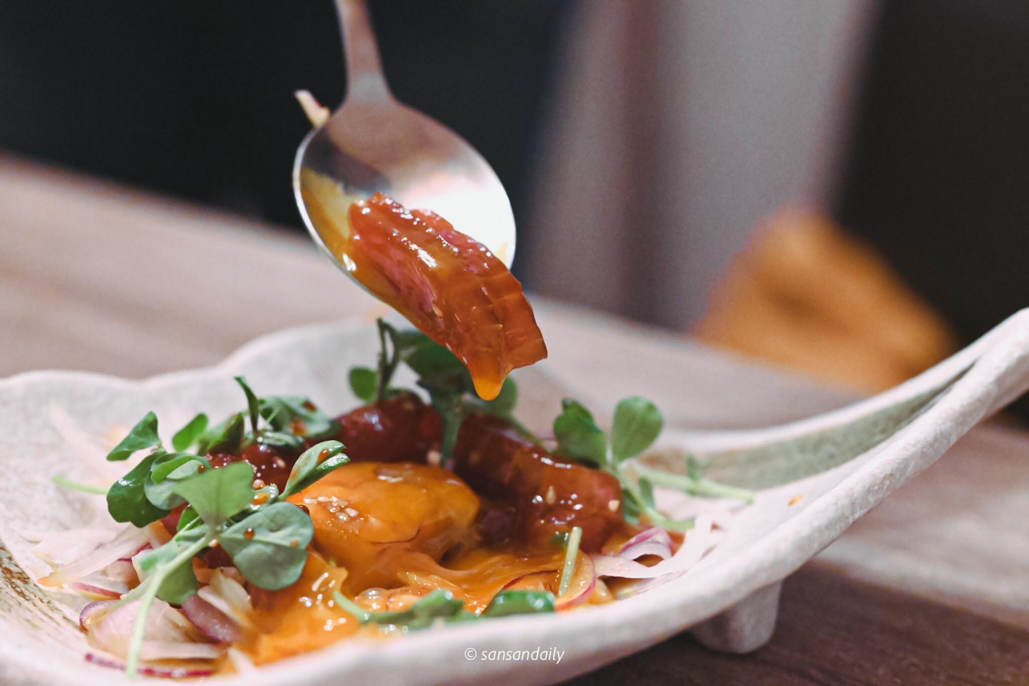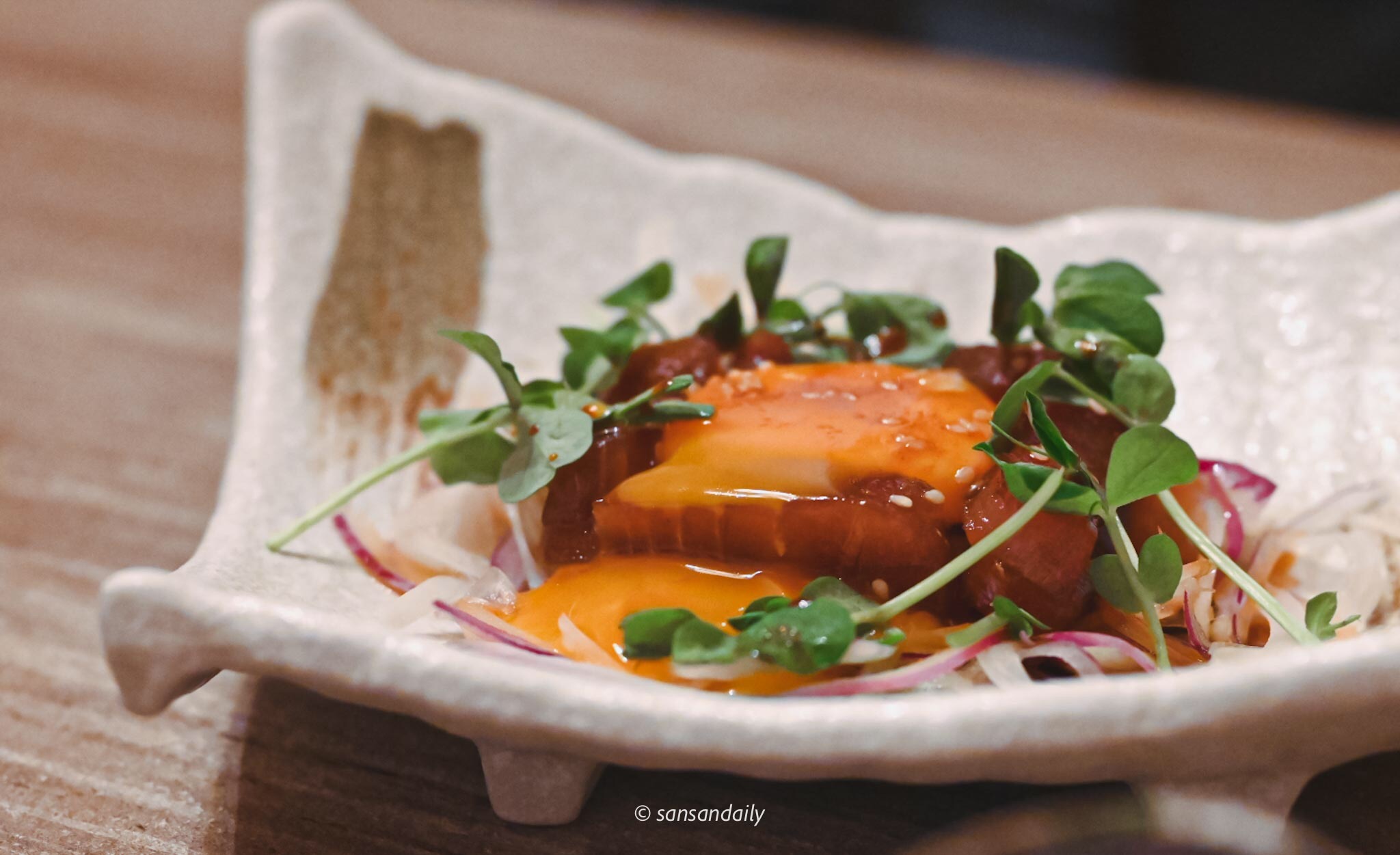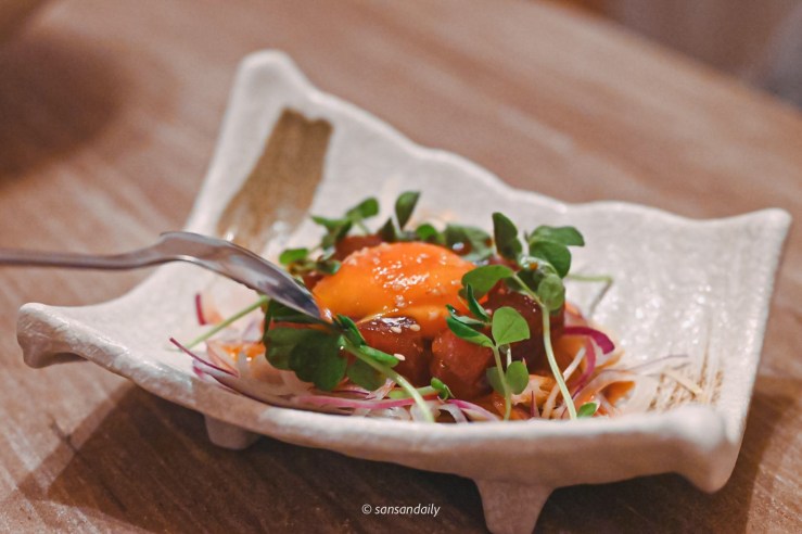 鮮嫩的鮪肉與涼拌洋蔥、特調醬汁、滑嫩蛋黃攪拌在一起,朋友說「味道很棒!相當開胃~」
