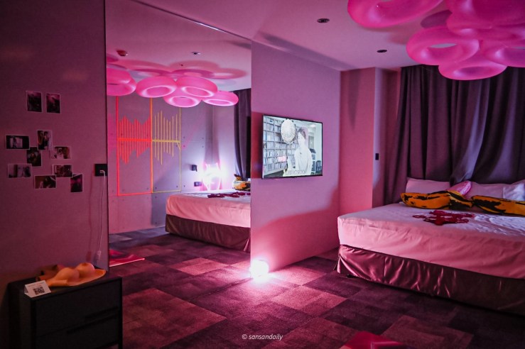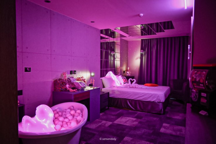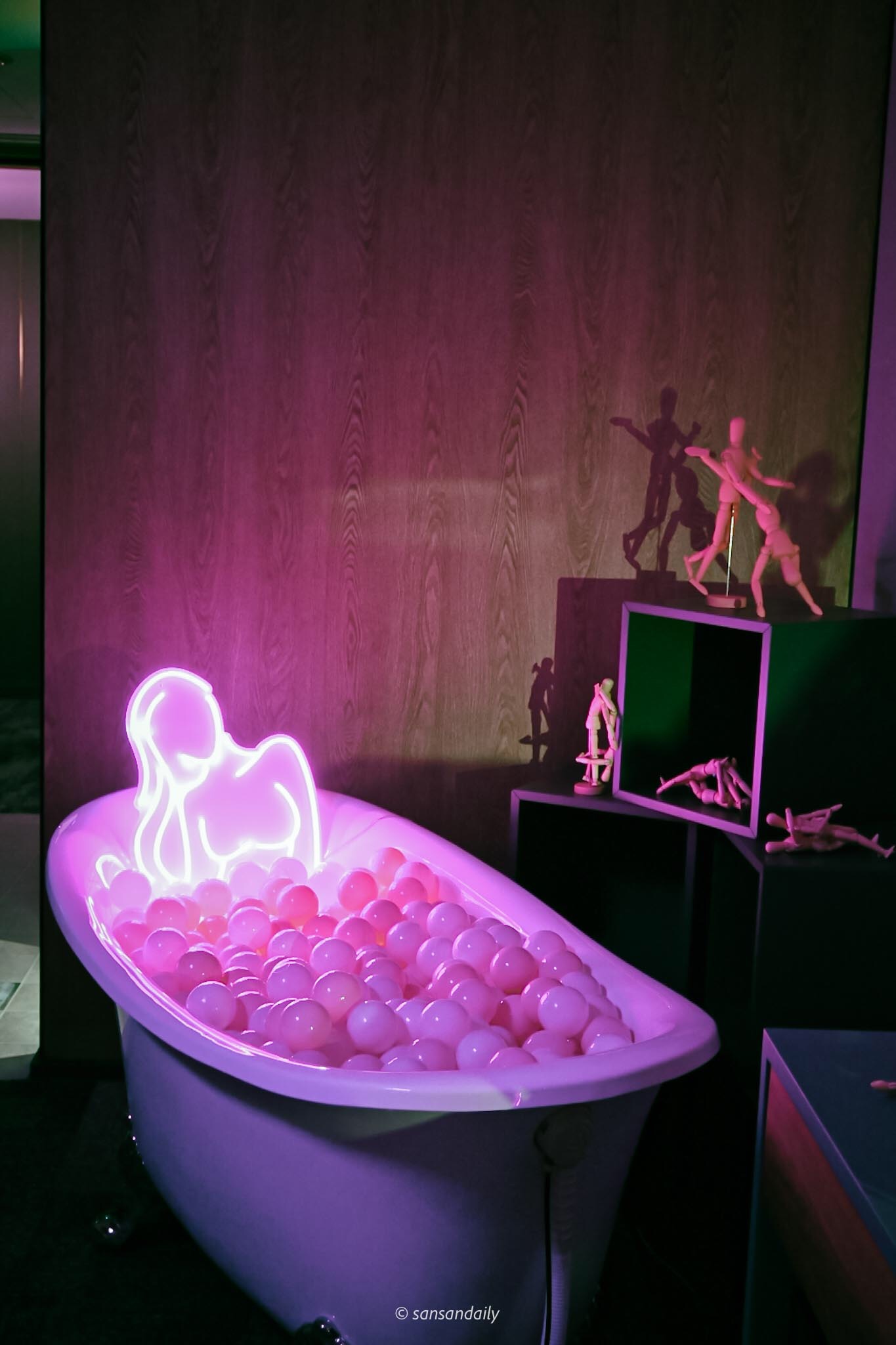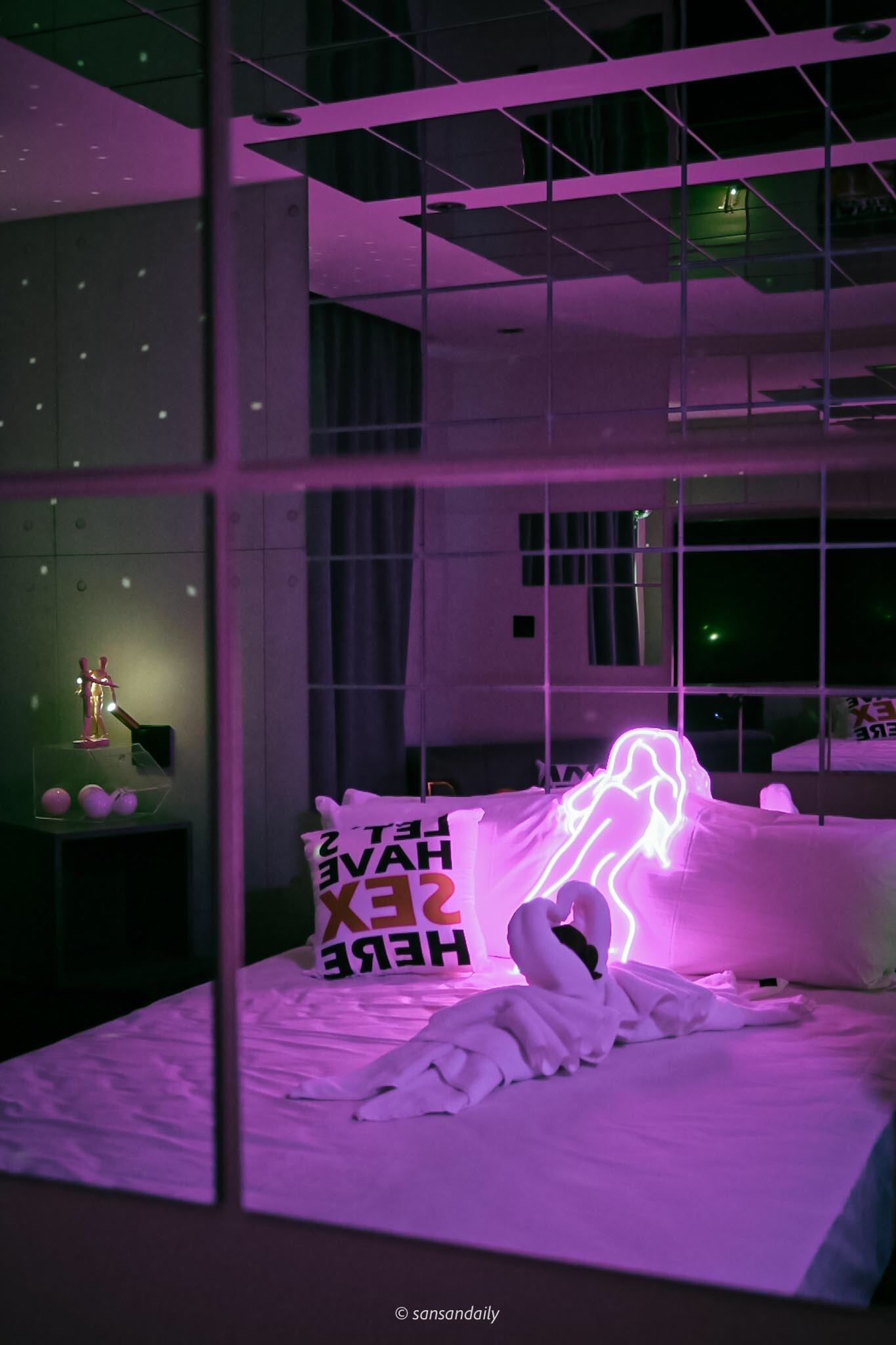 充滿情慾色彩的鏡面從床頭延伸至天花板,再鋪滿床前,浪漫的球池浴缸、天鵝造型毛巾以及各種性愛姿勢的人偶、霓虹燈擺飾,進到這間2人曖愛,慾望就是一顆直球撲面而來,「慾」不可擋。