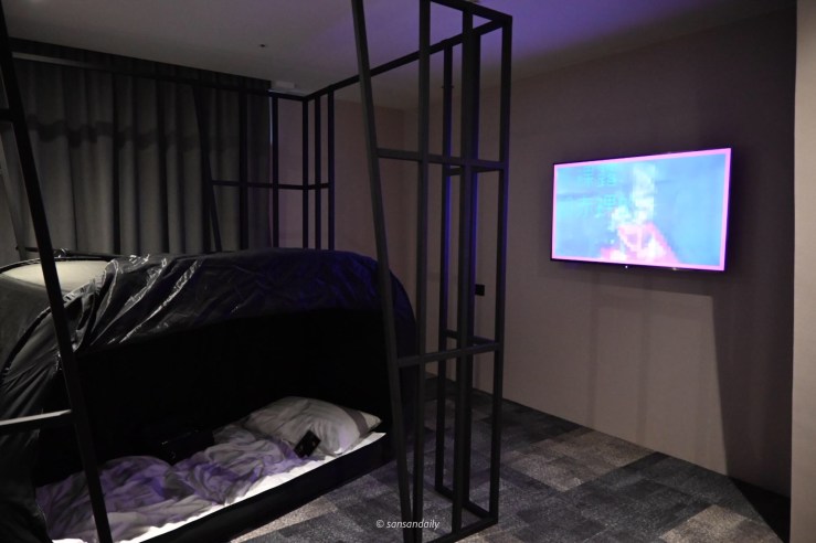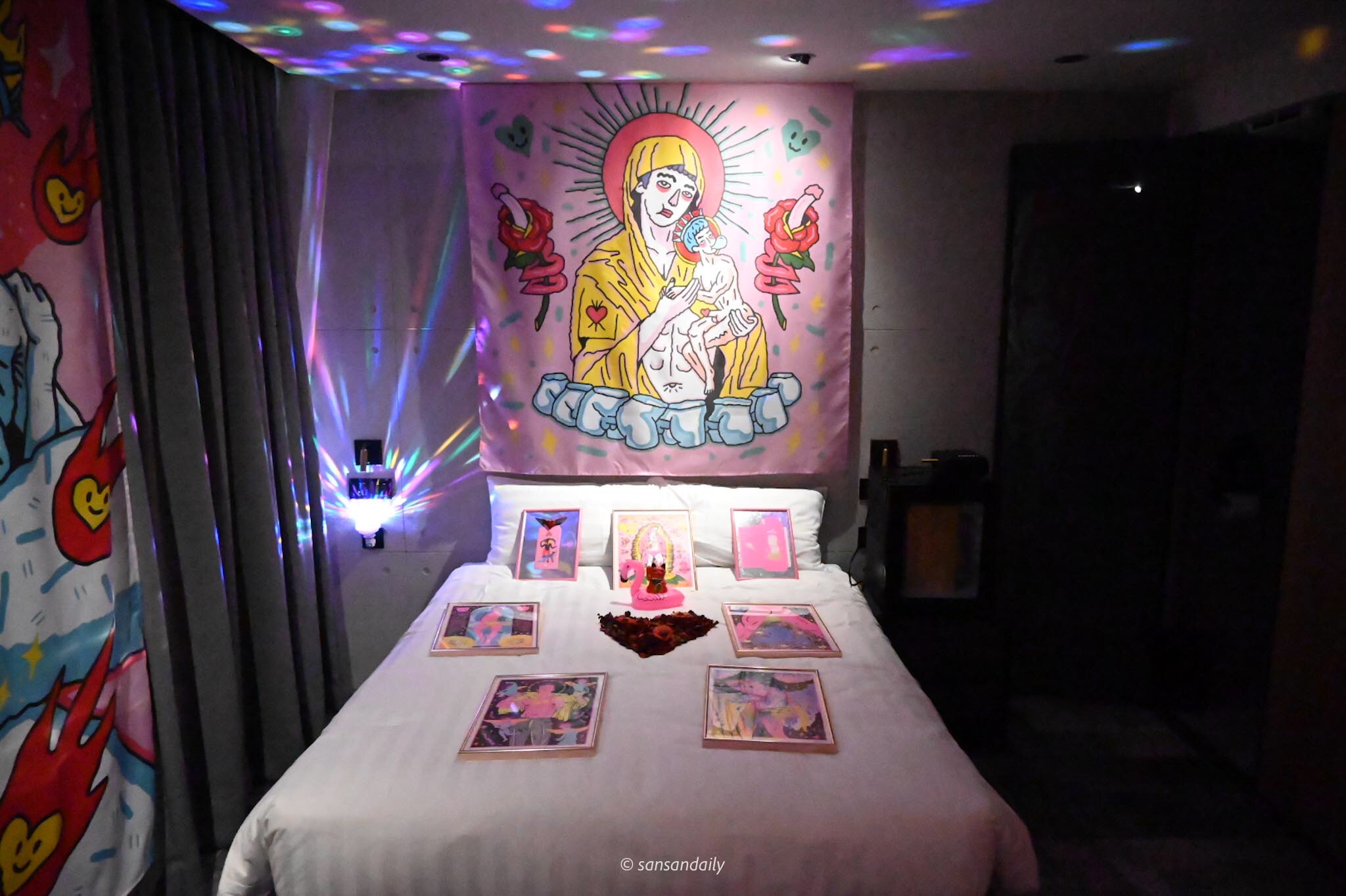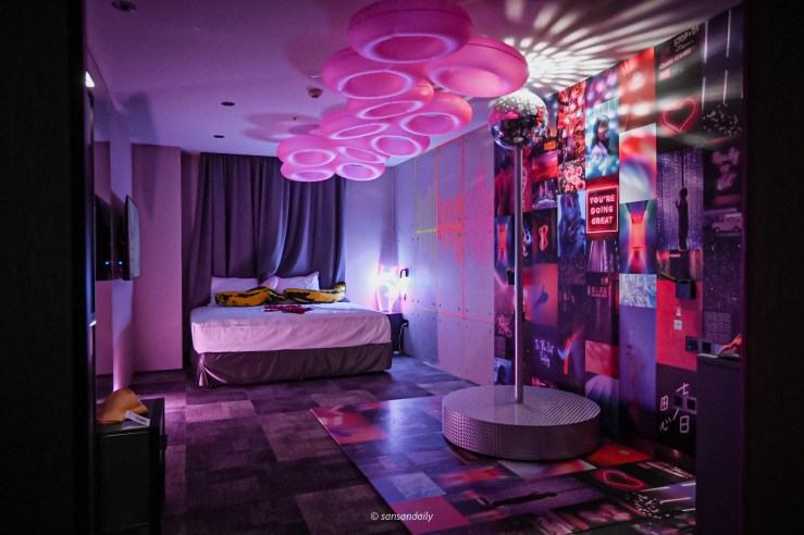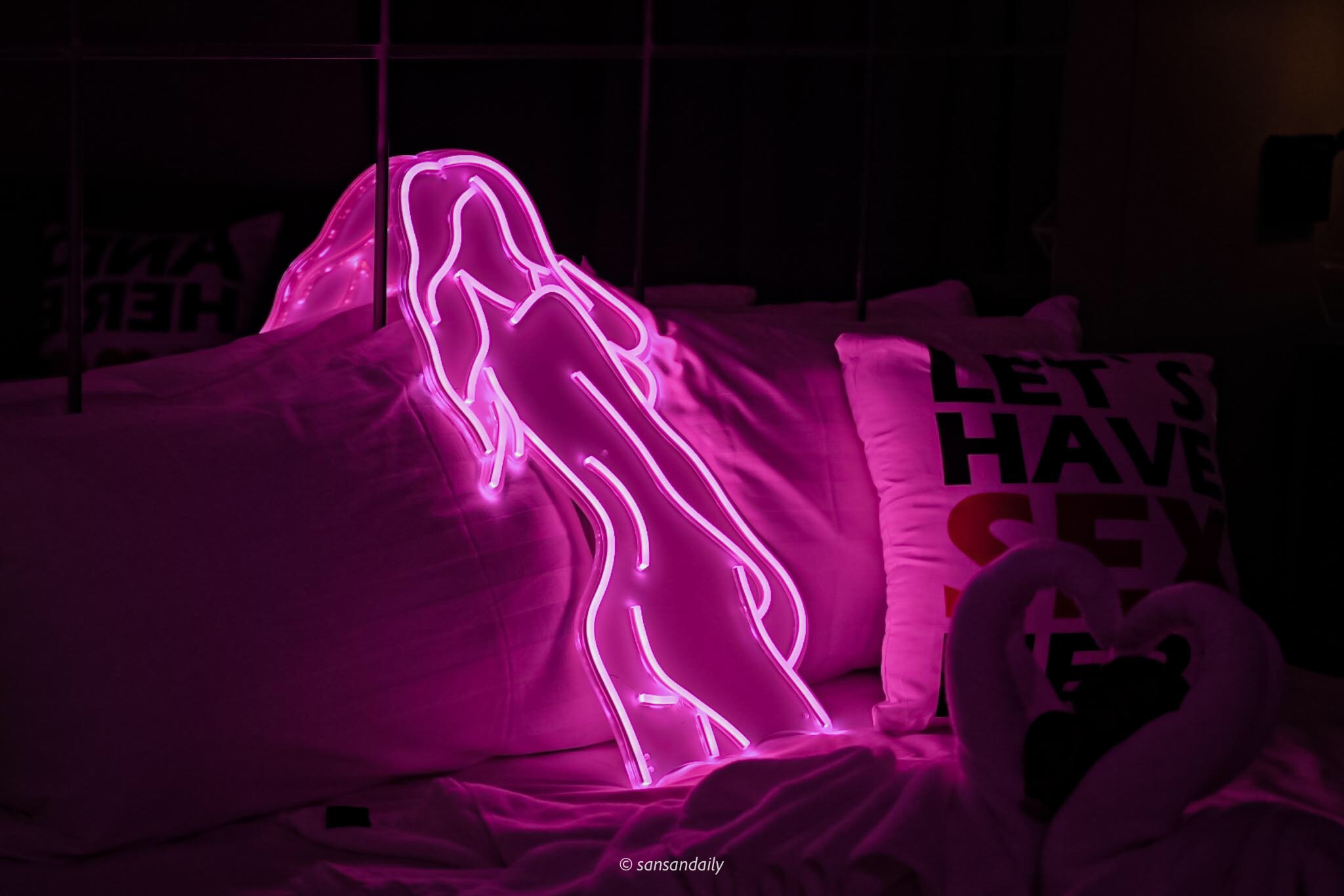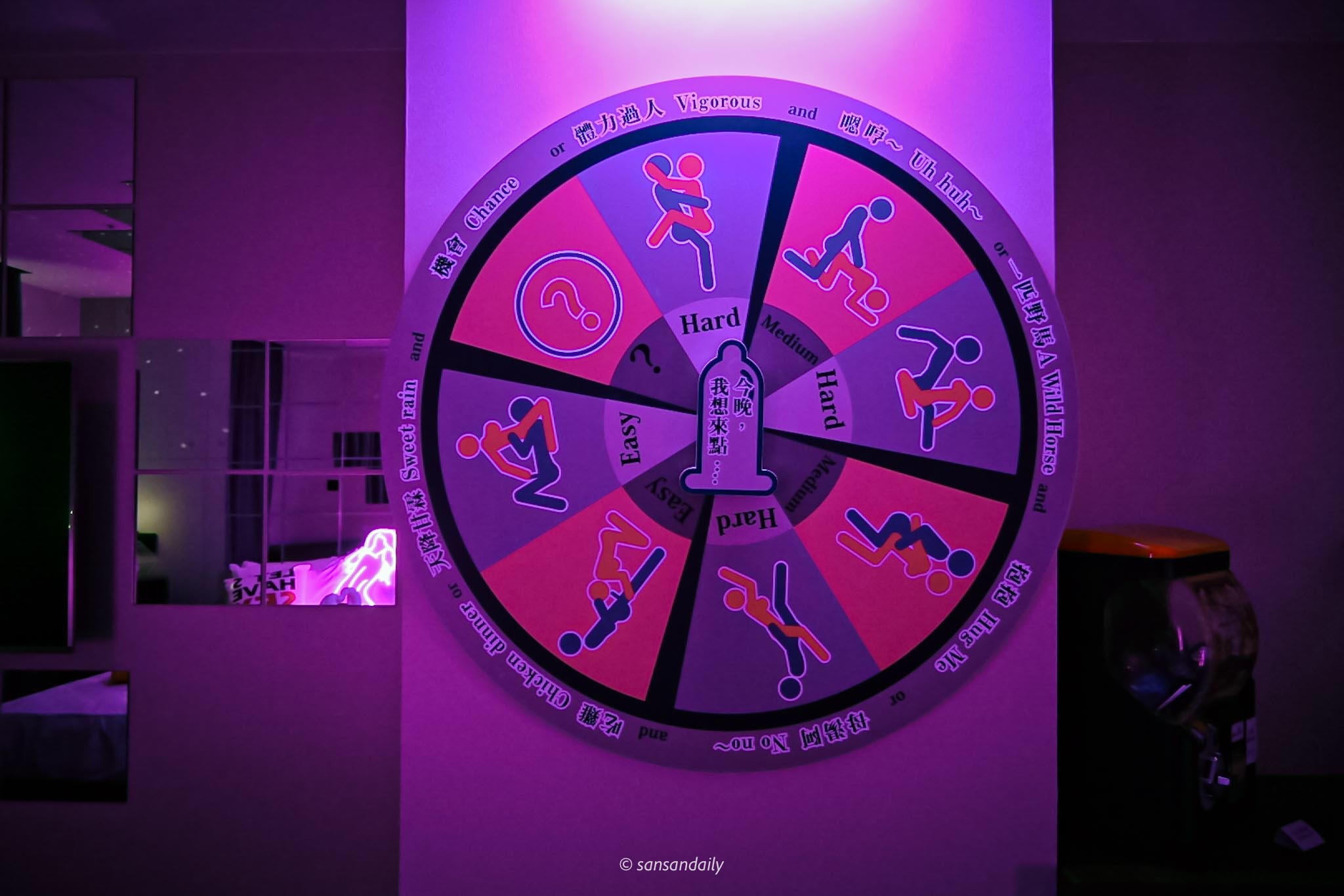 充滿情慾色彩的鏡面從床頭延伸至天花板,再鋪滿床前,浪漫的球池浴缸、天鵝造型毛巾以及各種性愛姿勢的人偶、霓虹燈擺飾,進到這間2人曖愛,慾望就是一顆直球撲面而來,「慾」不可擋。