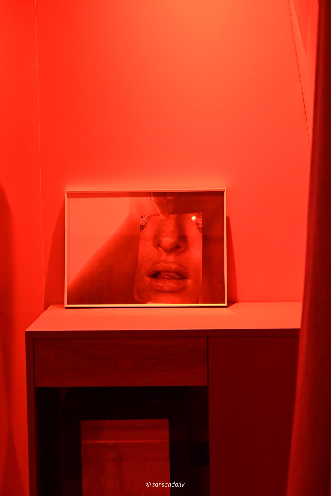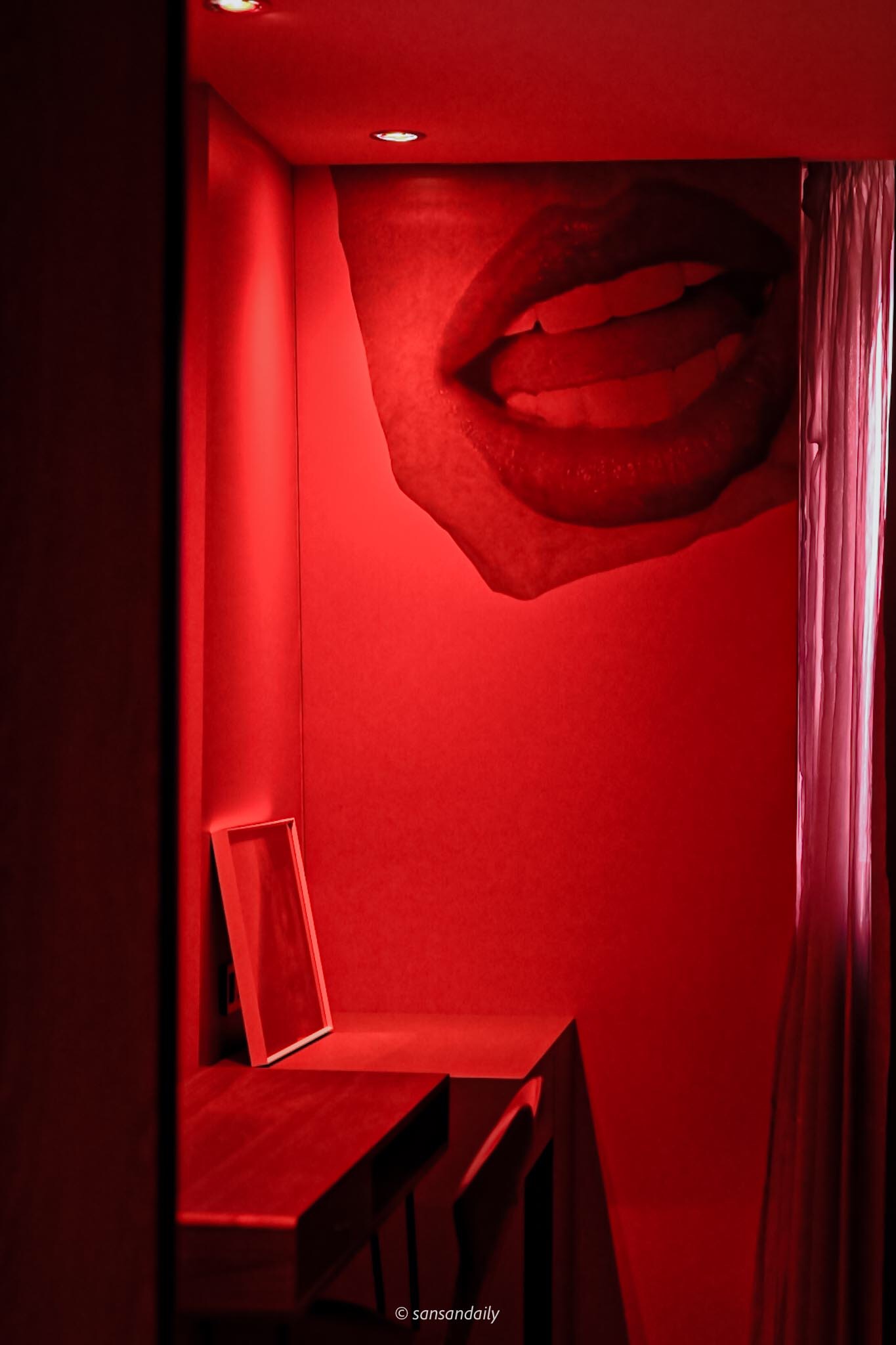 藝術家米蘭歐森,紅綠色盲患者,以大紅色與光影挑戰觀展者的極限,牆上帶點驚悚又具性暗示的大掌印,衝擊力十足。除了局部人體部位的掛畫,房內的屏幕上輪番播放充滿慾望的曖昧影片。
