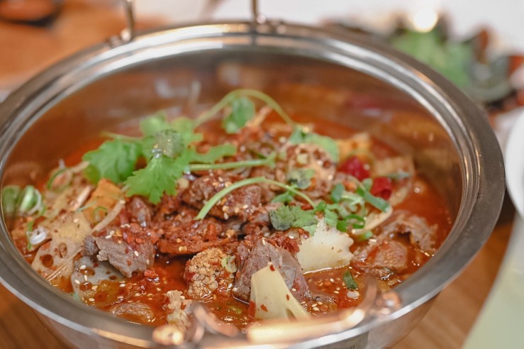 這次在華潮終於讓我親口吃到這道遠近馳名的川菜料理「樂山水煮牛」,香辣的郫縣豆瓣與蔬菜、肉片一起熬煮出濃郁的香辣,肉片相當入味香麻,和豐富的蔬菜配料一起,真的可以扒好幾碗白飯!
