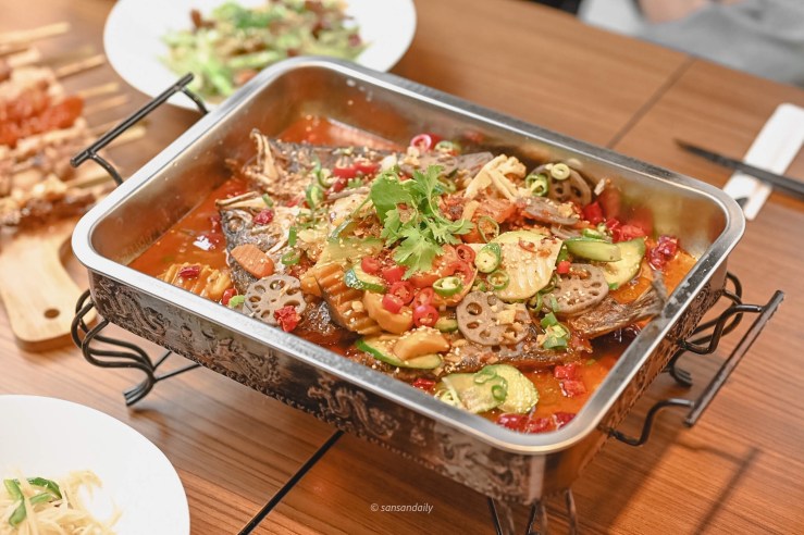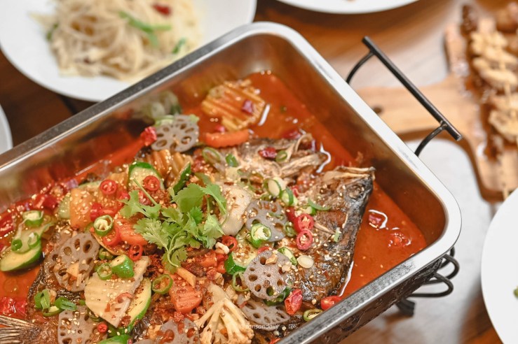 這道功夫菜「霧都諸葛烤魚」一上桌就驚艷四方,鮮豔的配菜與紅通通的醬汁,瞬間激起大家的食慾~
