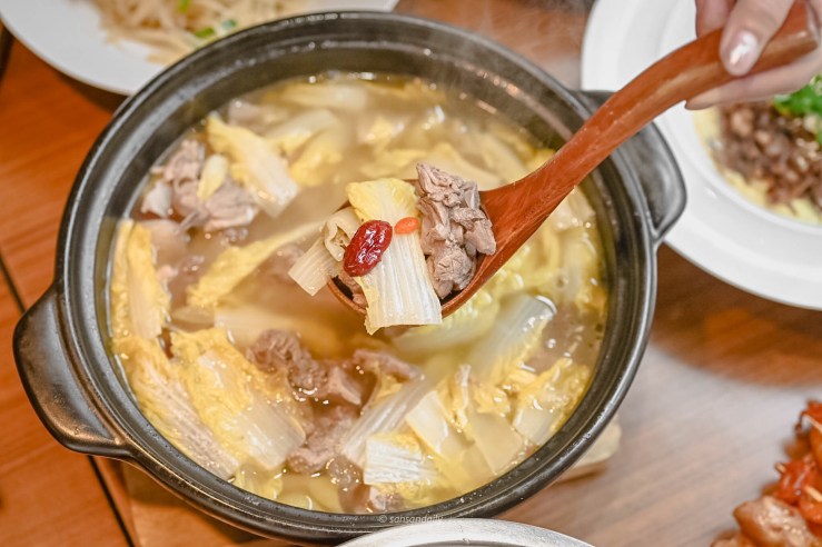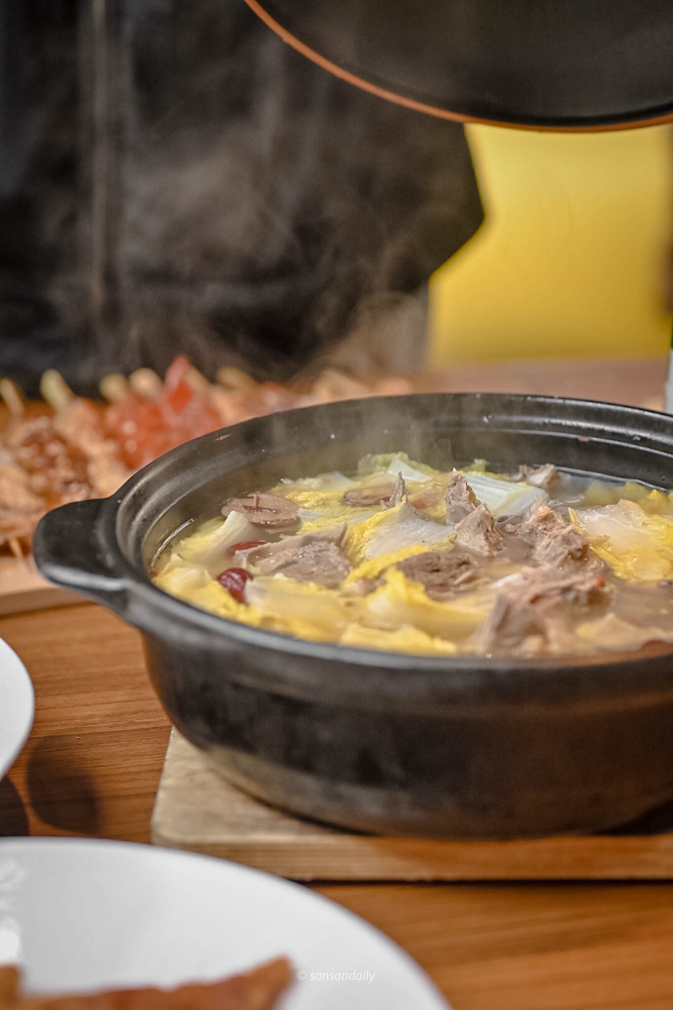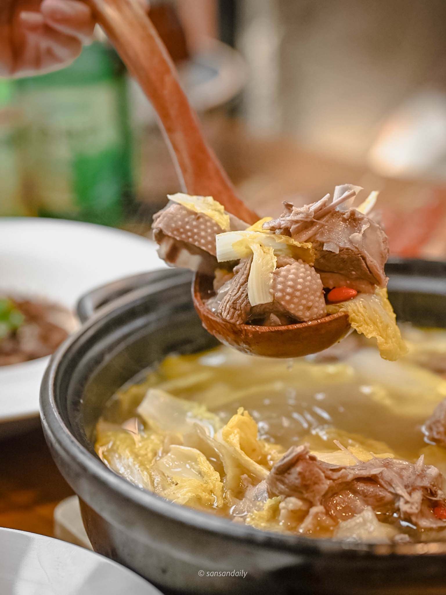 其中的真功夫在於湯底的熬煮過程,使用了老闆娘的獨家手藝「自製酸蘿蔔」,帶出乾淨開胃的酸度以及蘿蔔與娃娃菜的甘甜,還有每勺都可以撈到的爆量宜蘭櫻桃鴨。