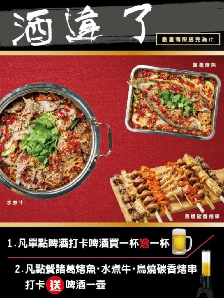 2️⃣點諸葛烤魚、水煮牛或鳥燒碳香烤串,打卡送啤酒一壺