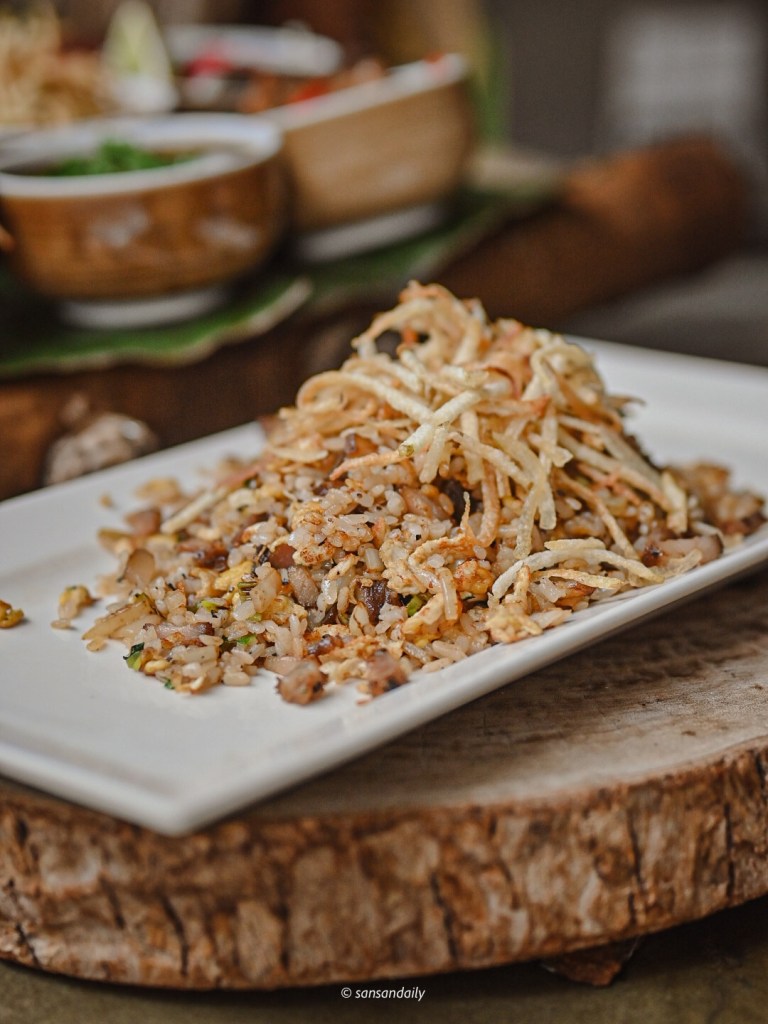 主菜「邵族炒飯」一上桌,粒粒分明陣陣飄香的炒飯立刻讓人食指大動,利用新山味的招牌烤肉當佐料,搭配雞蛋與洋蔥絲,最後鋪上炸馬鈴薯絲。