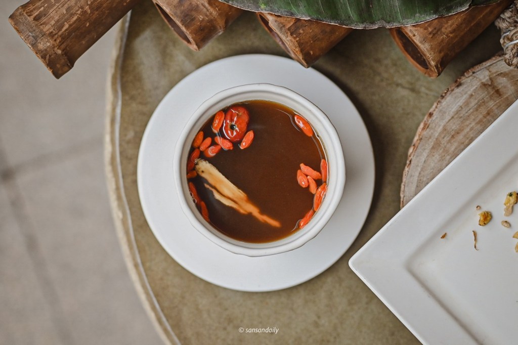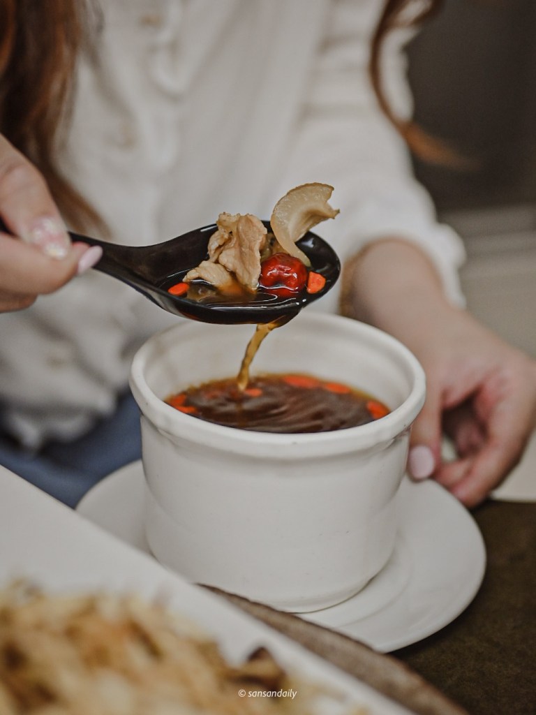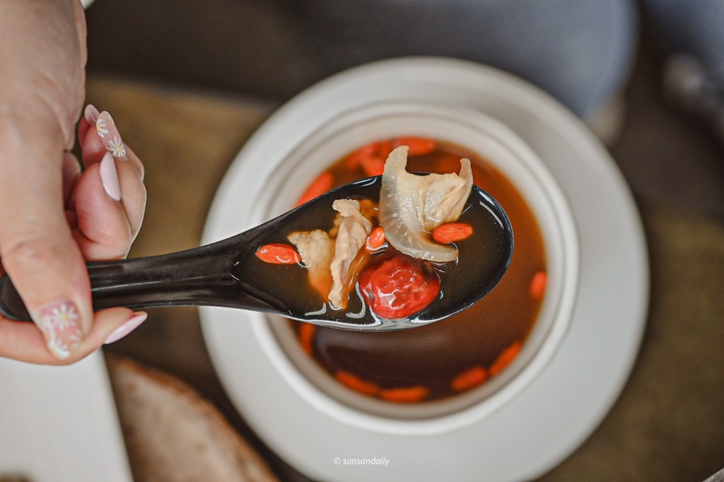 真材實料的靈芝養身湯,將豬大骨與靈芝炆火煨煮,湯頭的鮮甜甘醇,最後加入撒入紅棗、枸杞、 川芎等藥材增添香氣,是一款大人小孩都會喜愛的滋補湯品,尤其愛美的sansan當然一滴不剩喝光光!