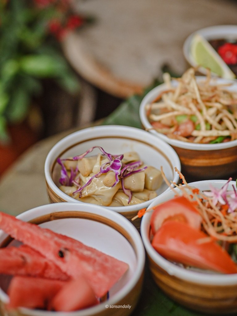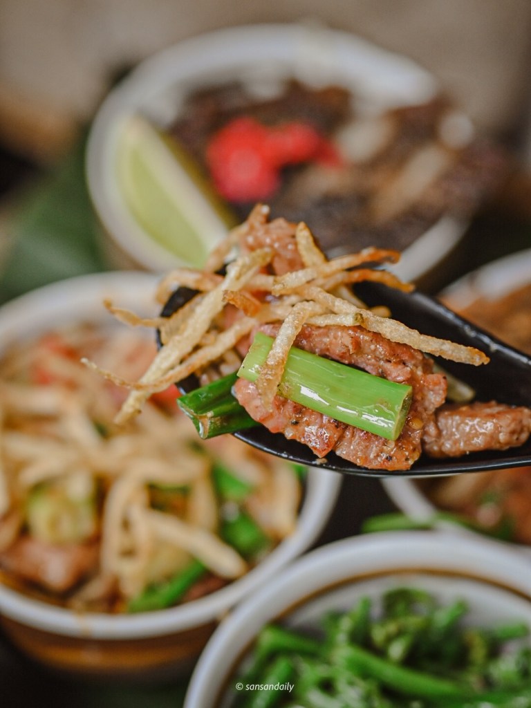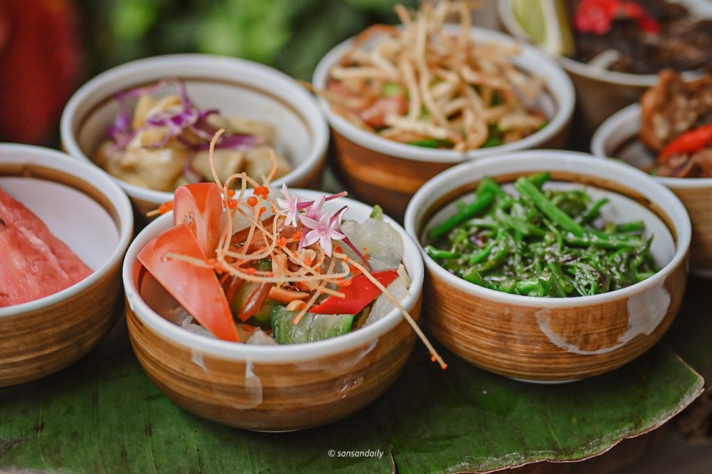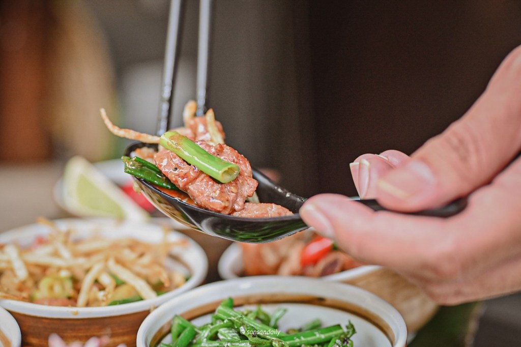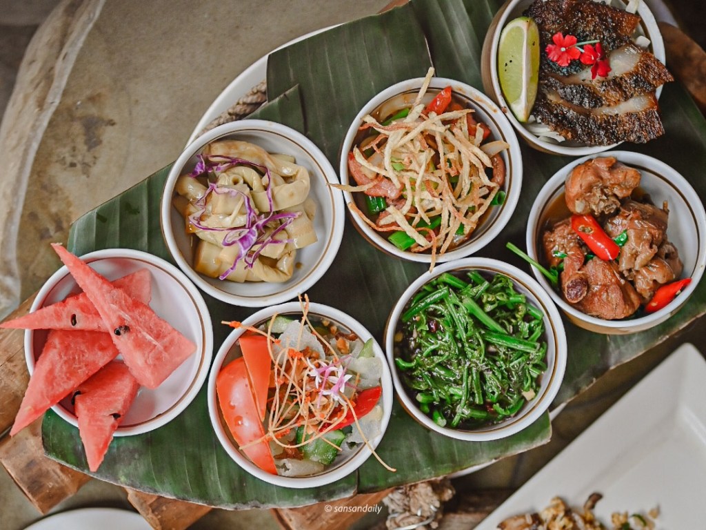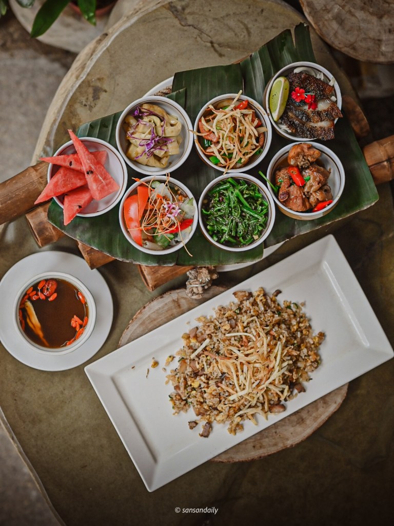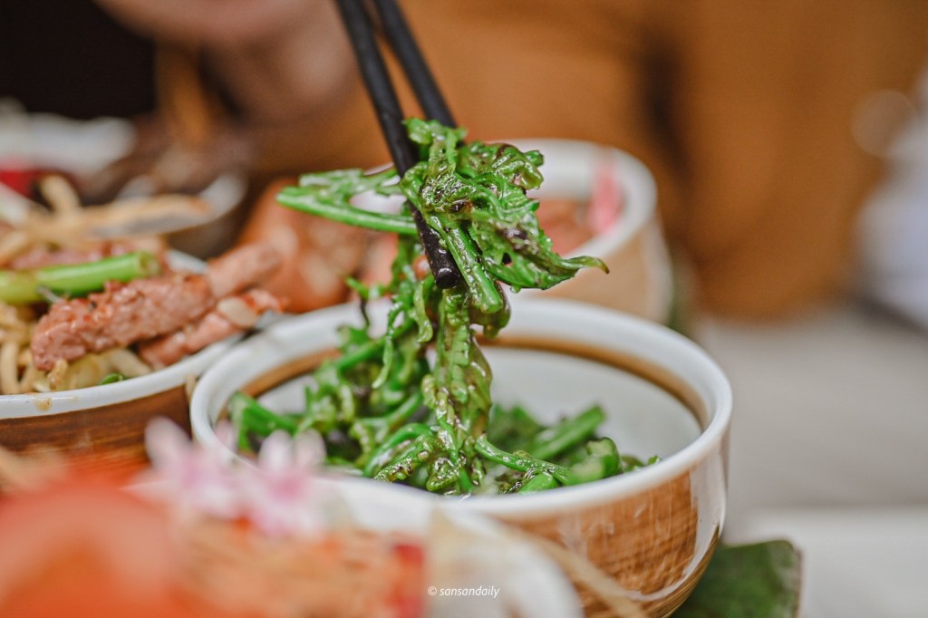 以竹筒作為托盤再擺上大片綠葉,充滿自然原始的擺盤,大大滿足了sansan對原住民特色餐廳的期待,點綴的小花、炸馬鈴薯絲也能看出大廚的用心。