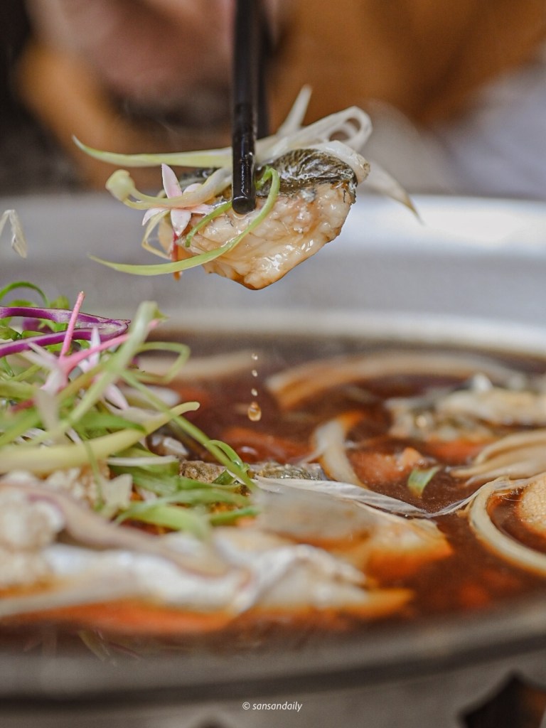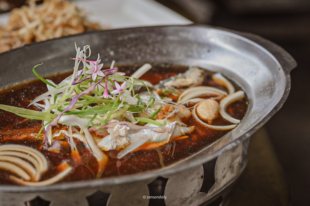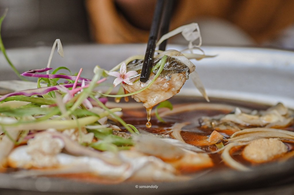 以洋蔥絲一同蒸煮最後鋪上青蔥絲與小花點綴,魚肉的口感細嫩讓我們讚不絕口,還人品爆發的碰上一隻帶卵的總統魚!