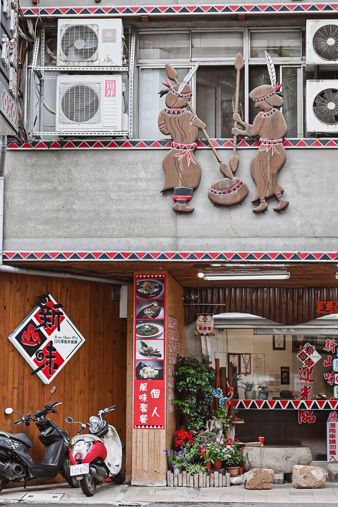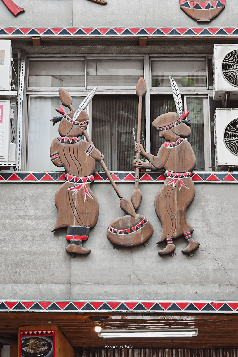新山味邵族風味餐廳的門面以濃濃原民風味的木雕與圖騰裝飾,在美食街上更顯特色引人注目。