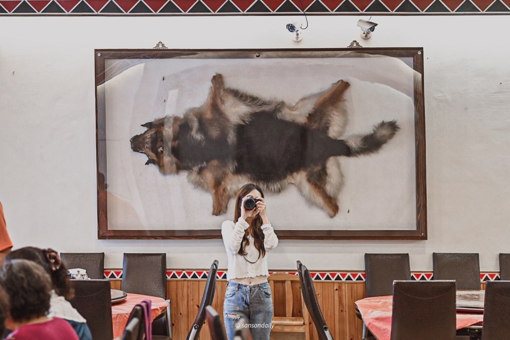 超巨大的狼皮是老闆的收藏,鹿皮則是家族狩獵留下的戰利品。