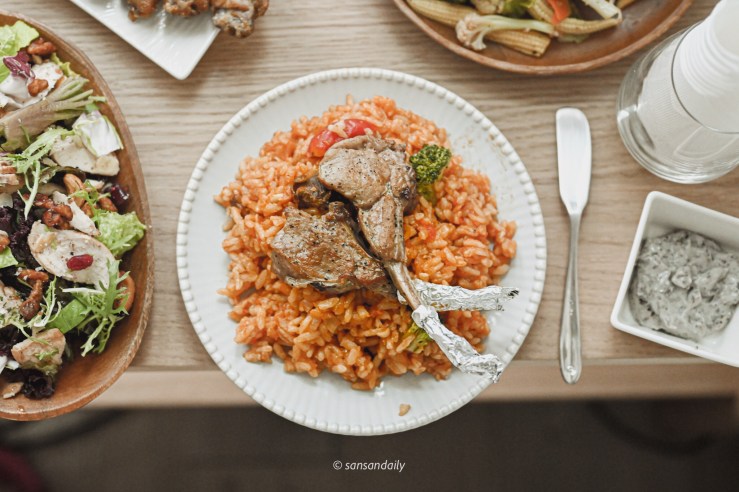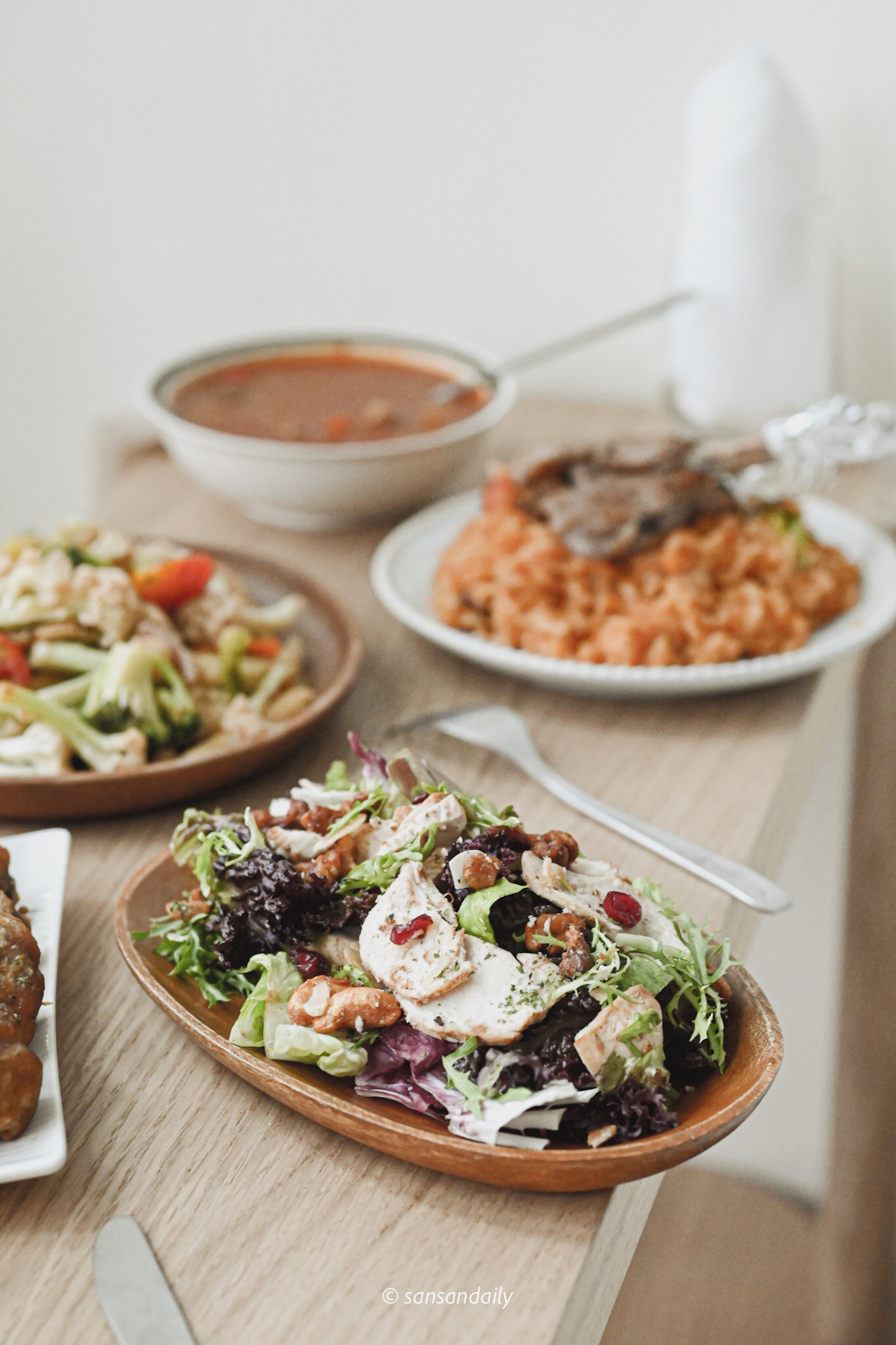 附餐選擇「洋蔥優格核果雞肉沙拉」和「蕃茄牛肉蔬菜湯」