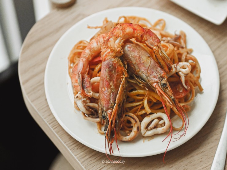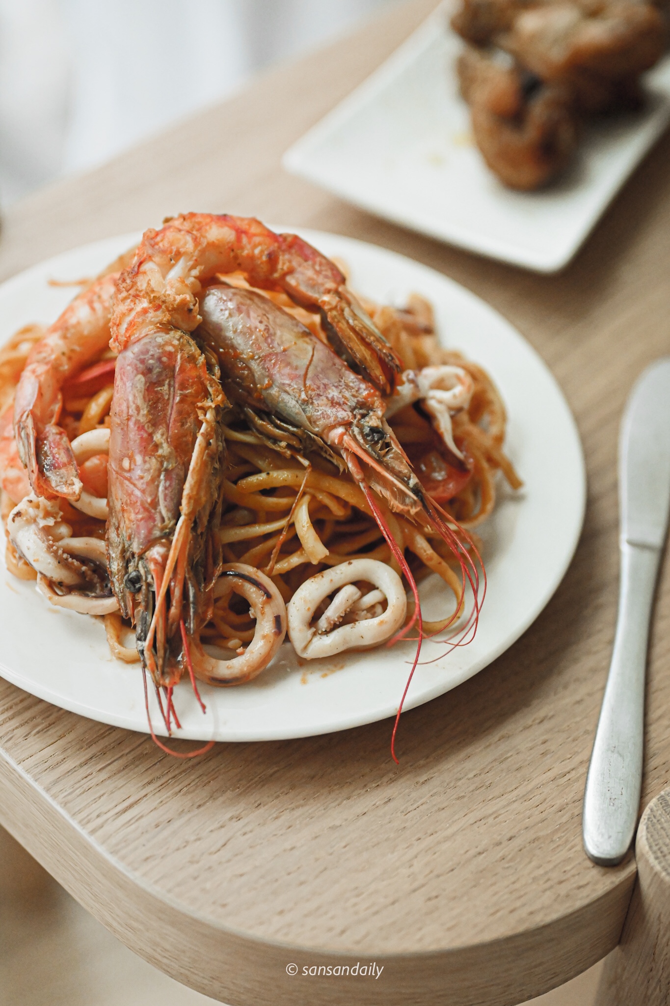 細扁麵也完整吸附上充滿海鮮鹹香的蝦醬,