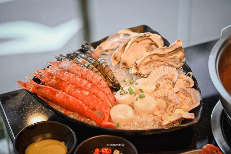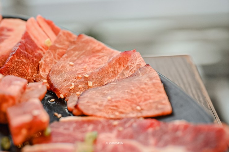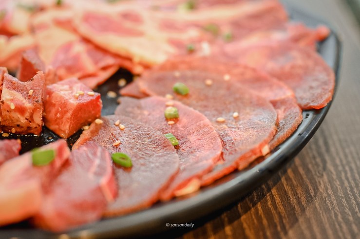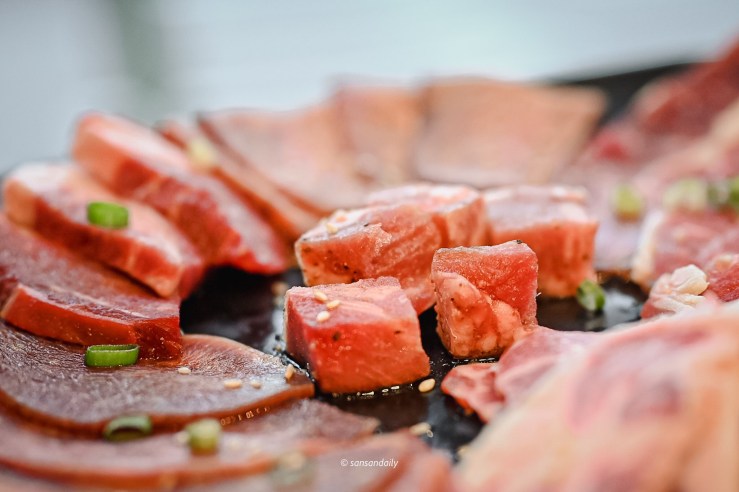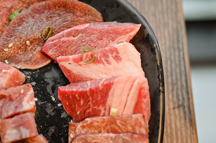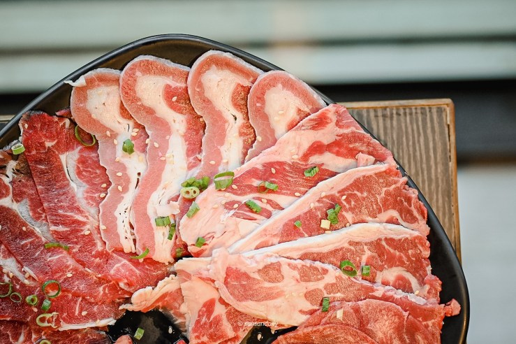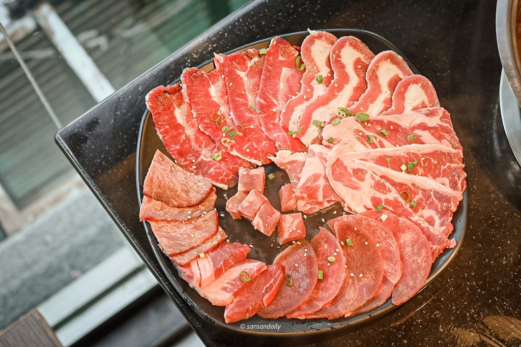 肉質的部分也非常讓人驚艷!我們點了骰子牛、安格斯黑牛、櫻桃鴨菲力、嫩肩板腱牛、安格斯黑牛、牛舌等,肉品都是現點現切厚度和大小都很扎實~看著一大盤色澤鮮豔、油花分布漂亮的肉盤,口水都要滴下來啦!