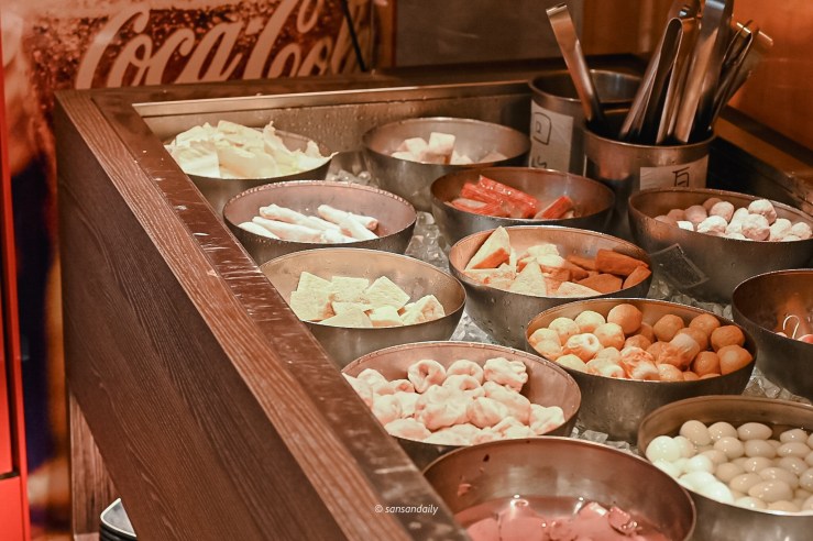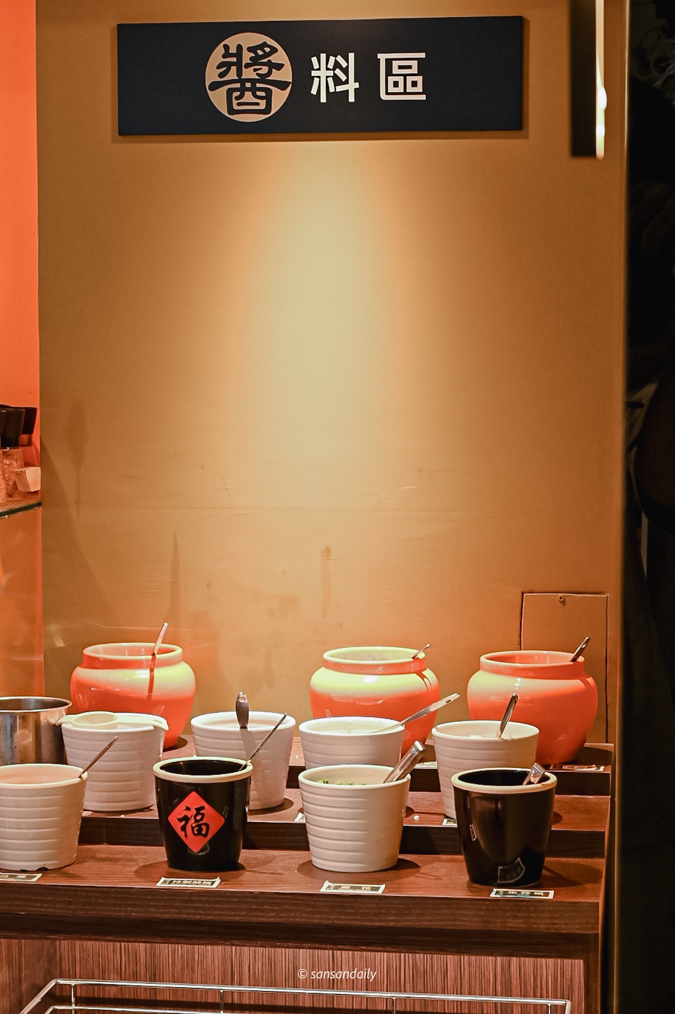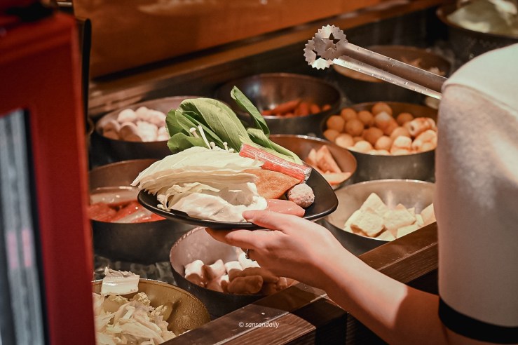 二樓豐富的自助區有新鮮蔬菜、雞蛋、王子麵、冬粉和各式火鍋料,種類相當多。