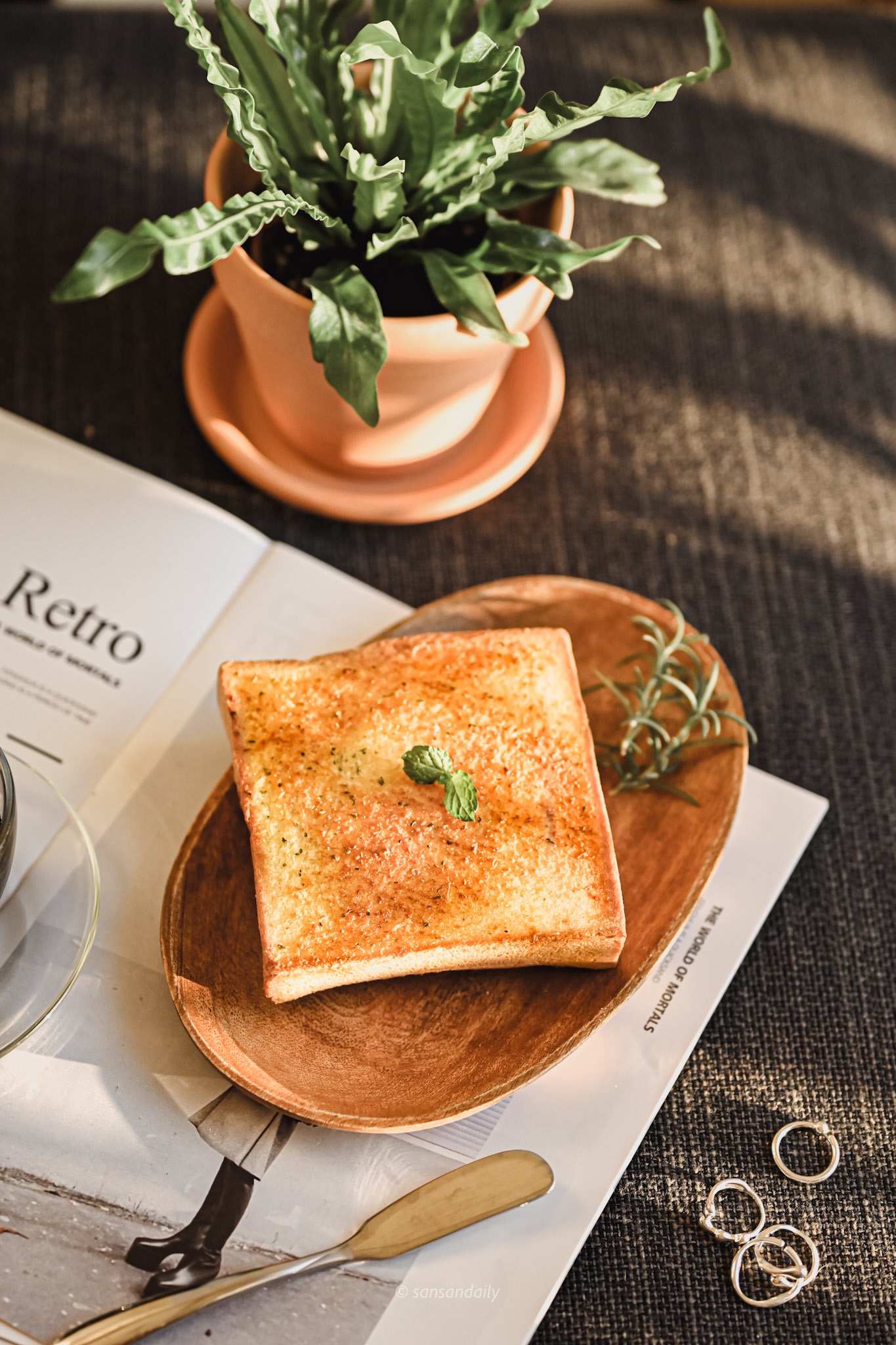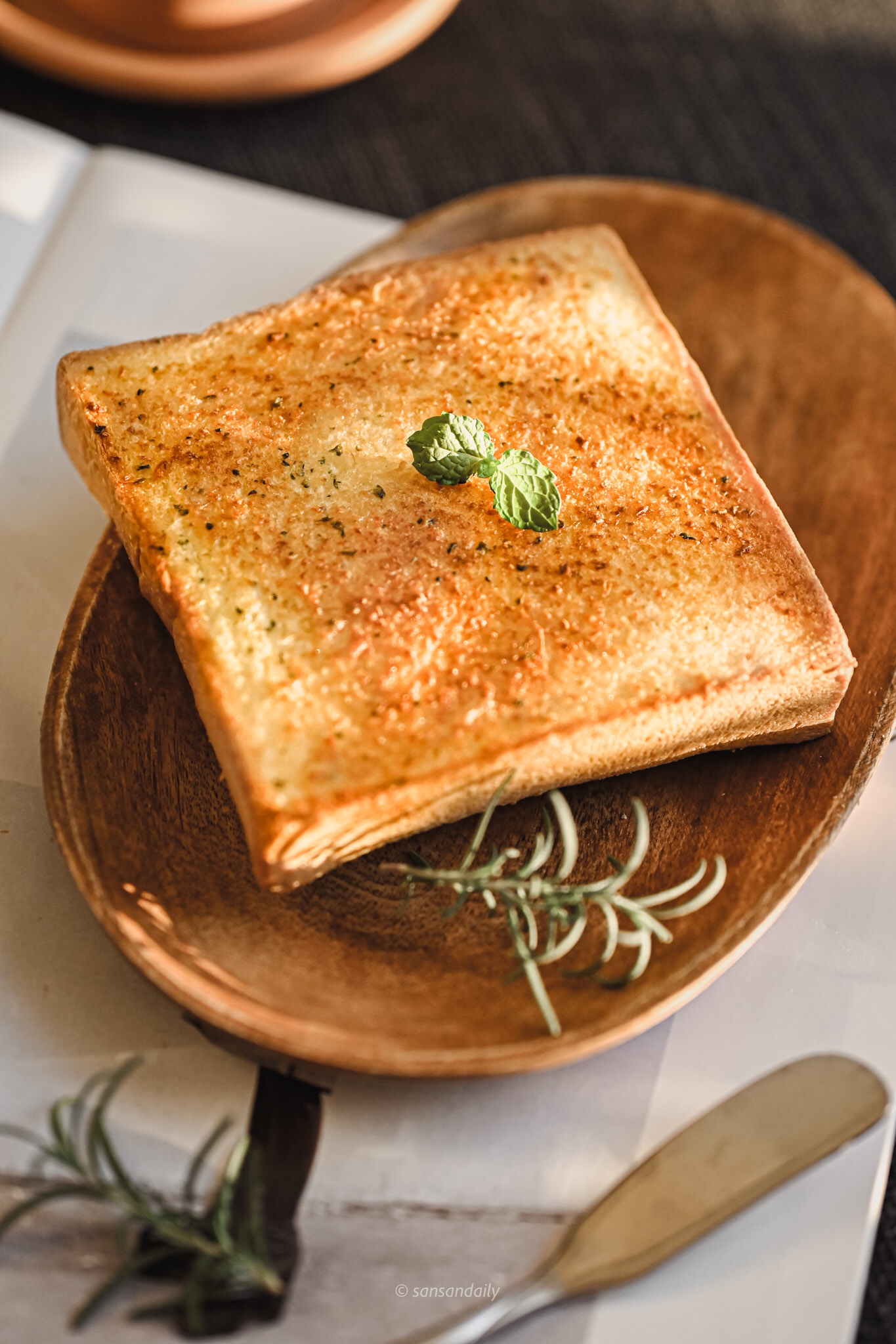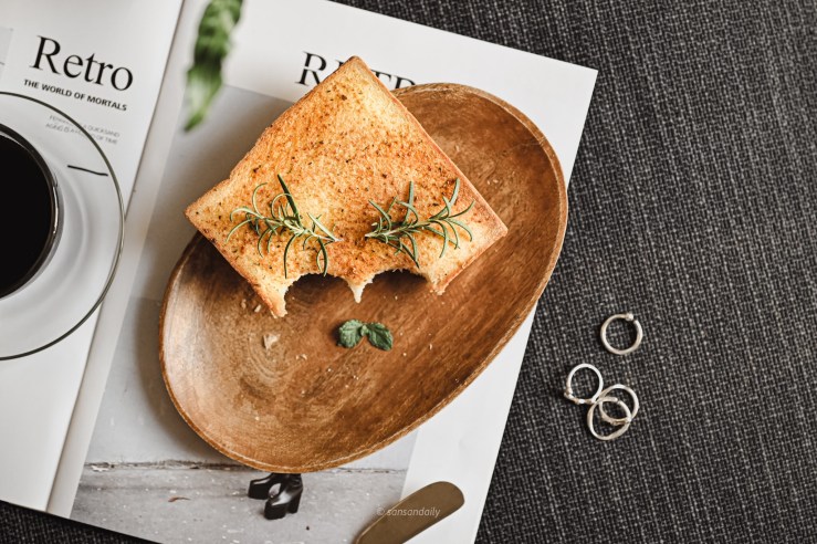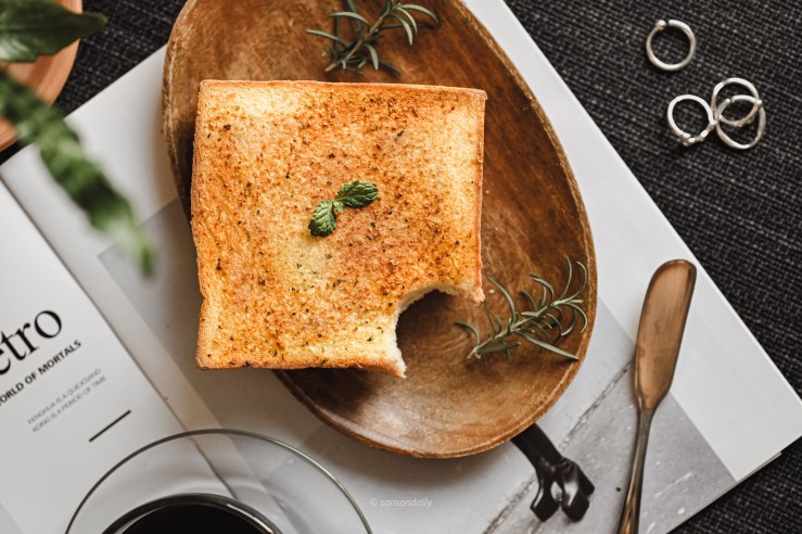 吐司表層吸附了青醬香蒜充滿鹹香的油,