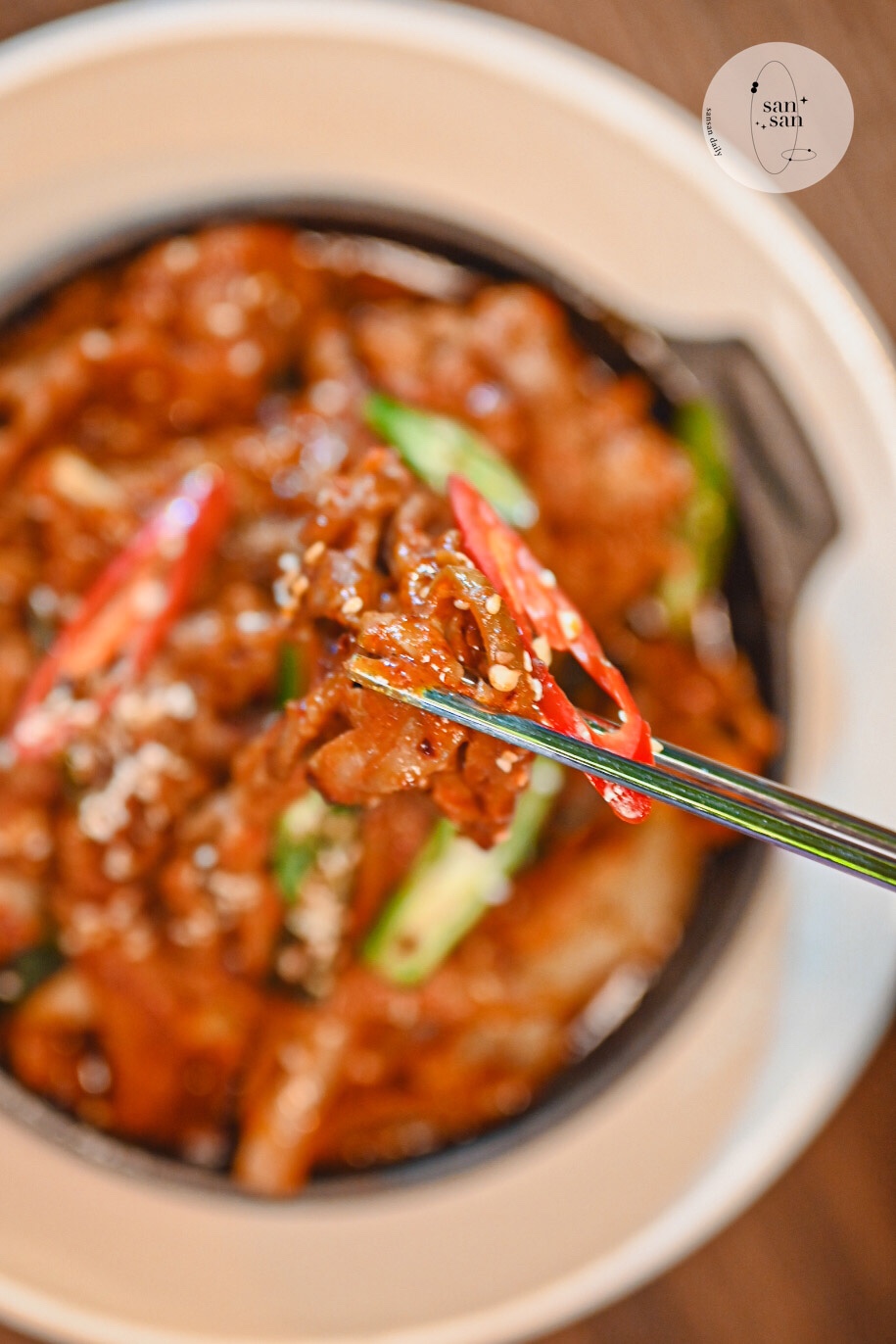 說到韓式料理,絕對少不了辣炒豬肉吧!雖然只吃小辣的我們,也不能錯過招牌的長家辣炒豬肉,簡直是白飯殺手(拿人蔘雞附的白飯來配)笑