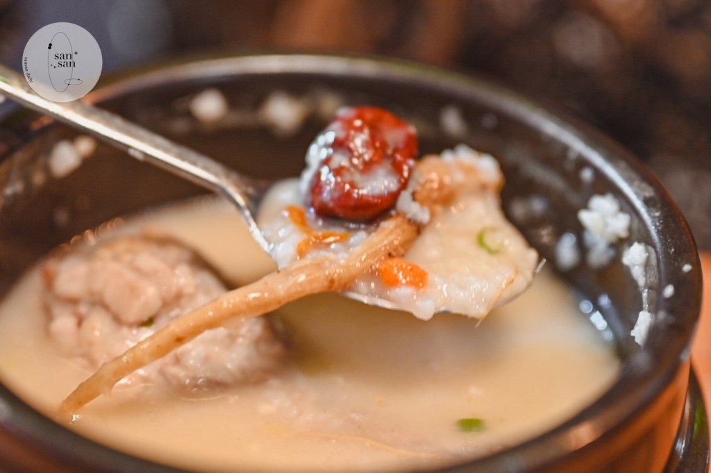 特別值得一提的是那杯「人蔘酒」,用高麗蔘浸泡韓國燒酒,趁熱倒入人蔘鍋中倍增香氣。