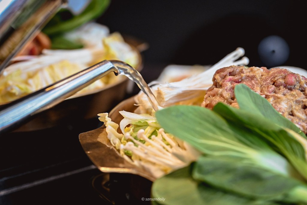 銅盤烤肉上桌後加入湯底開始加熱