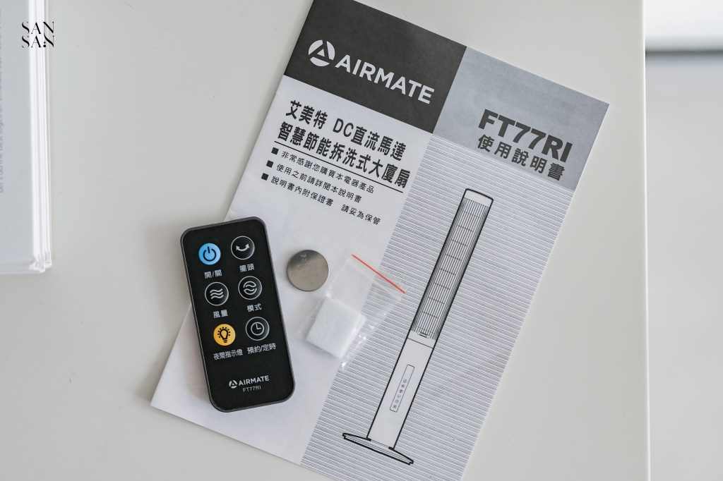 「艾美特DC直流馬達智慧節能拆洗式大廈扇」也有附上一組遙控器與電池、說明書,比較不一樣的是,艾美特的這台大厦扇有芳香精油槽,提供更換的棉片可以交替使用不同香味的精油,讓家裡保持香香的浪漫幸福感!