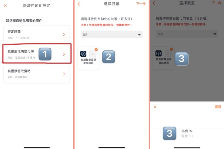 第三步:設定「溫度/濕度」,勾選奧創溫濕度感應器(步驟3)