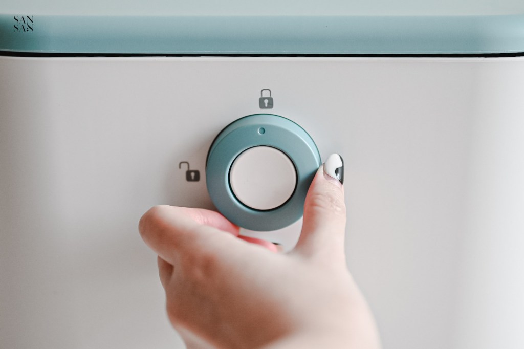▲ 兒童安全鎖,需旋轉至lock的標誌方可啟動。可防止運作過程中兒童誤按燙傷,且開蓋即停止運作。