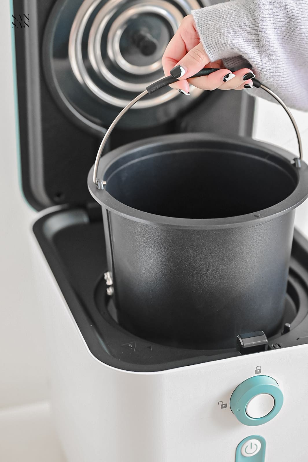 ▲ 不沾內鍋,有提把可輕鬆拿取,倒出處理好的廚餘或清洗。
