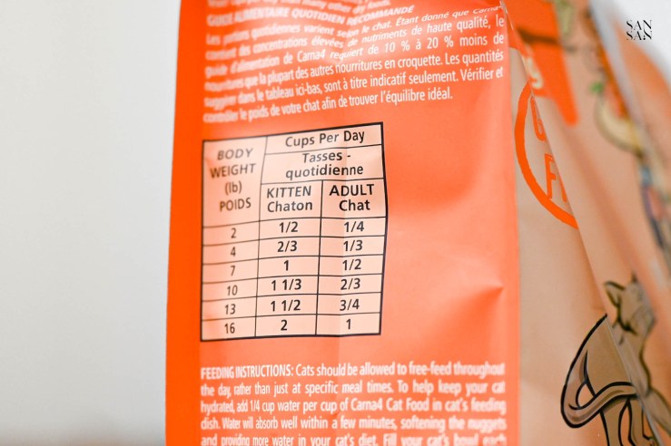 包裝袋上還貼心提供不同重量的貓咪建議餵食份量