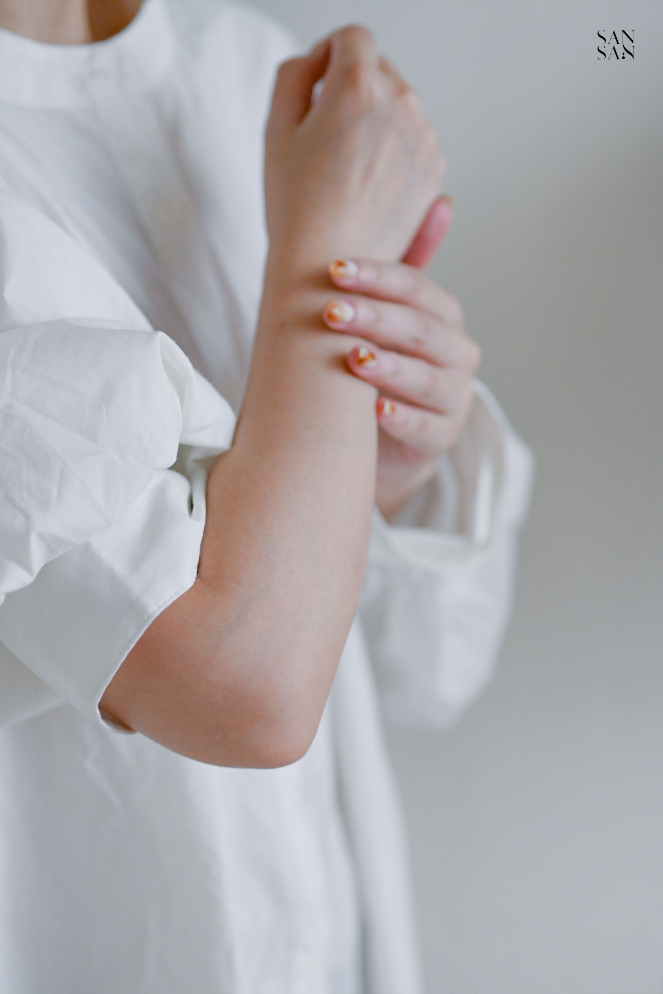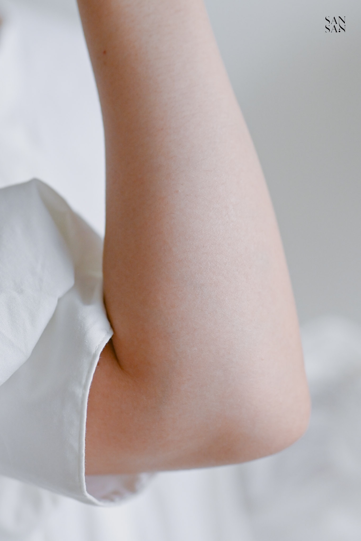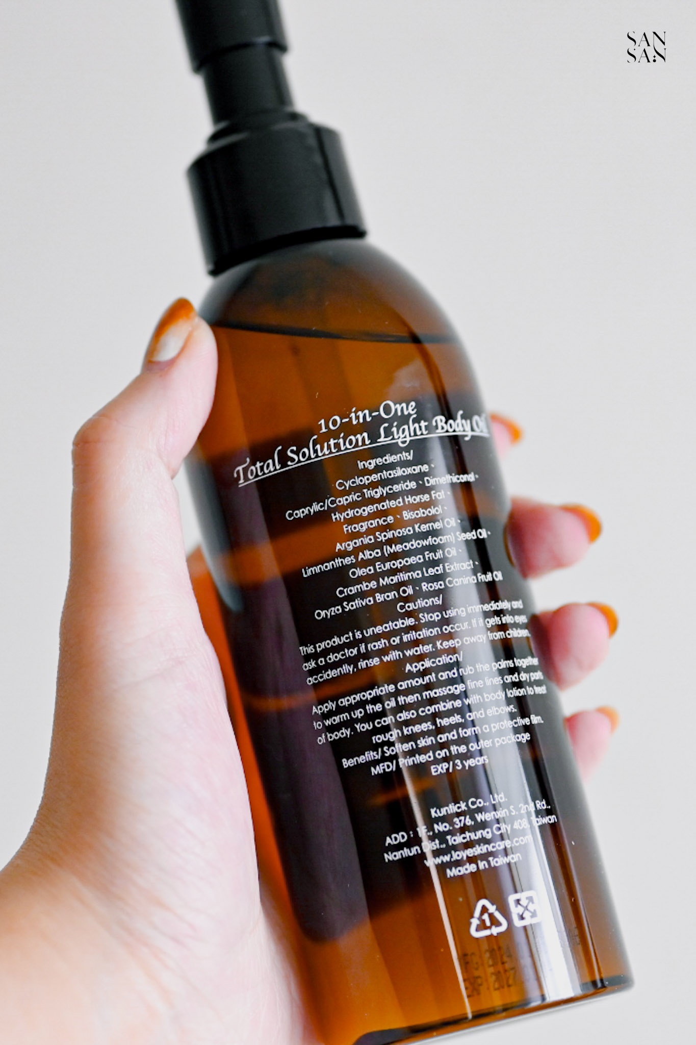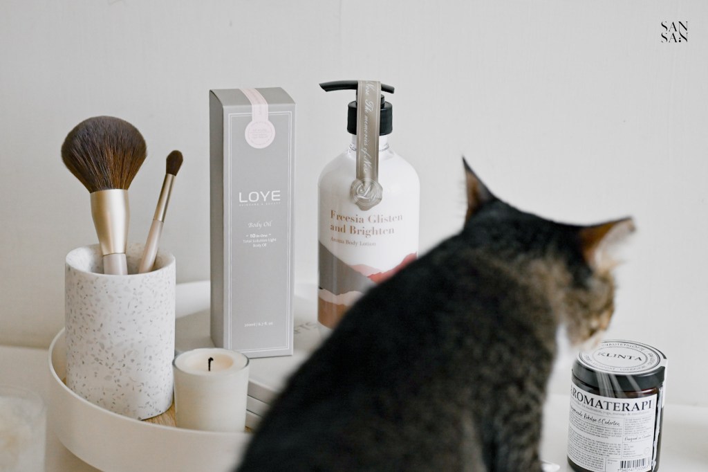 sansan的習慣是先用身體油加強容易有皺紋和較粗糙的地方,如頸部、手肘、膝蓋、屁股蛋等,再全身抹乳液,大約半小時左右的保養時光,放著輕鬆的音樂,是最舒壓的me time!