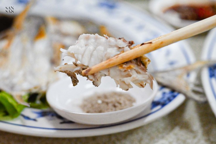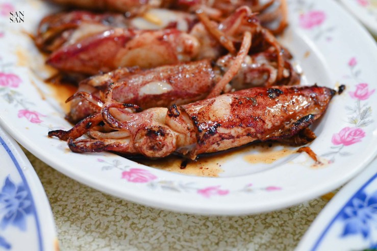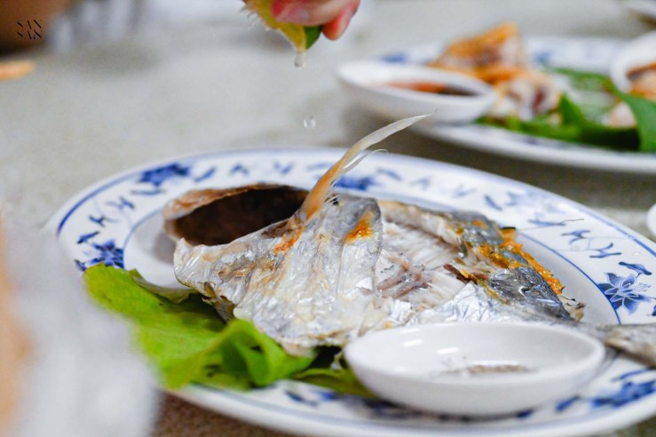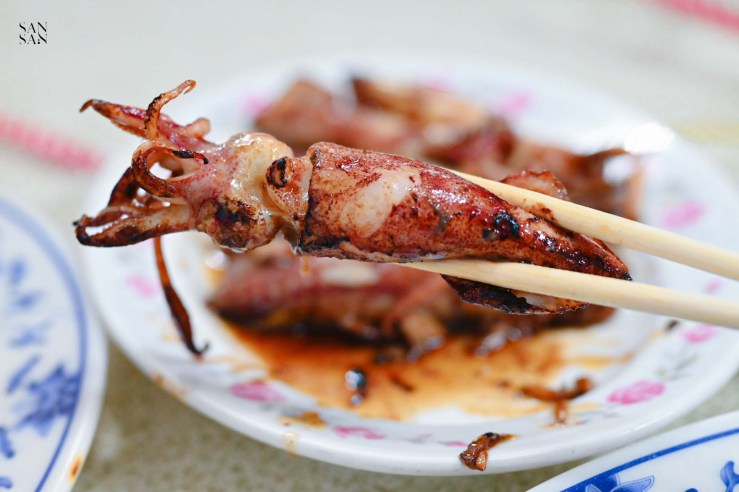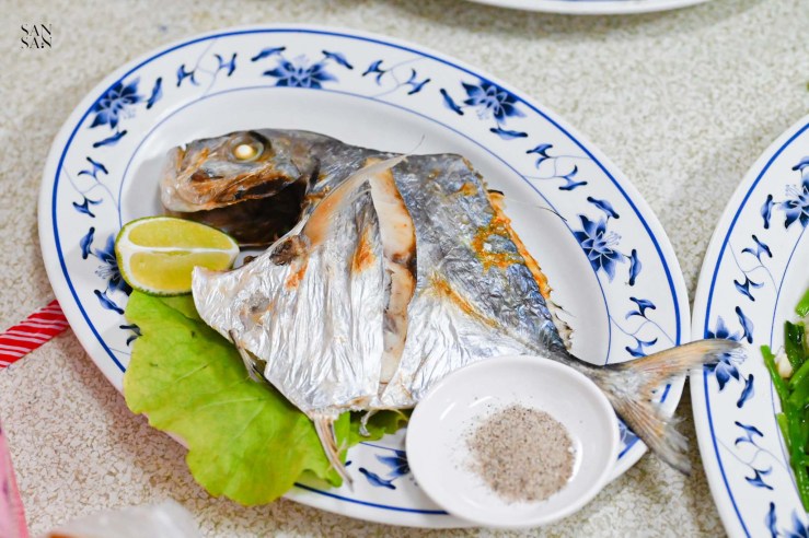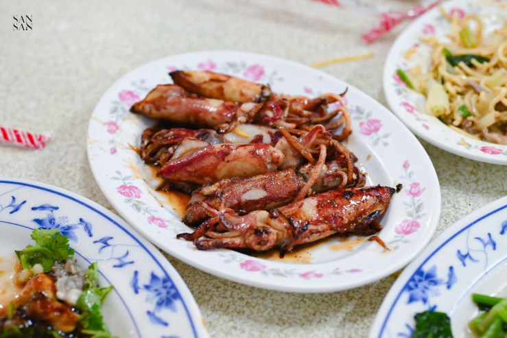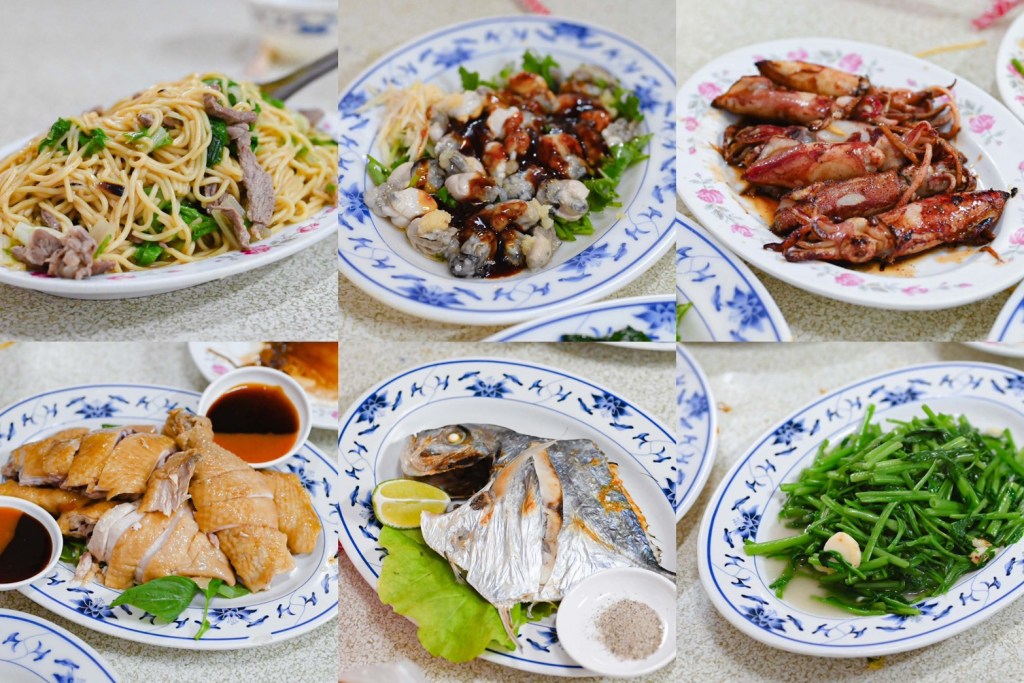 我們一行6人點了主食2份、油雞1盤、烤魚1隻、烤小卷1份、青菜2盤、蒜蓉香菜蚵仔1份。