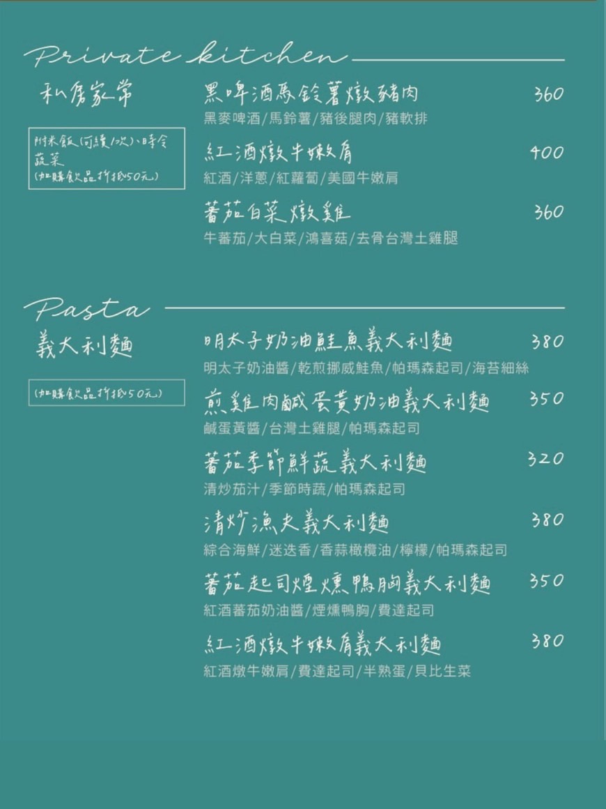 菜單除了私房家常、義大利麵、燉飯、早午餐和各式沙拉外,還有可作為開胃菜的享食小點、多人共食的炸物、甜點等。相約聚餐菜單也會更具話題性,雖然單價稍高但吃過就知道一分錢一分貨!每道都好吃呀🥰