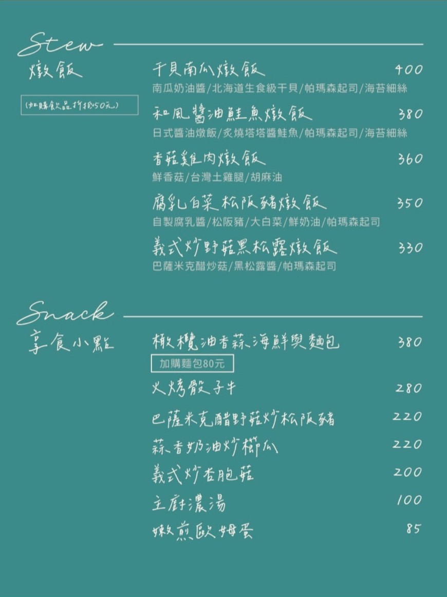 霧夜 最吸引我的是他們家的特色餐點,有別於一般常見的口味,這裡可以吃到不一樣的菜單,如:腐乳白菜松阪豬燉飯、黑啤酒馬鈴薯燉豬肉、蕃茄白菜燉雞、鹹蛋黃奶油義大利麵、伯爵茶氣泡飲等等。