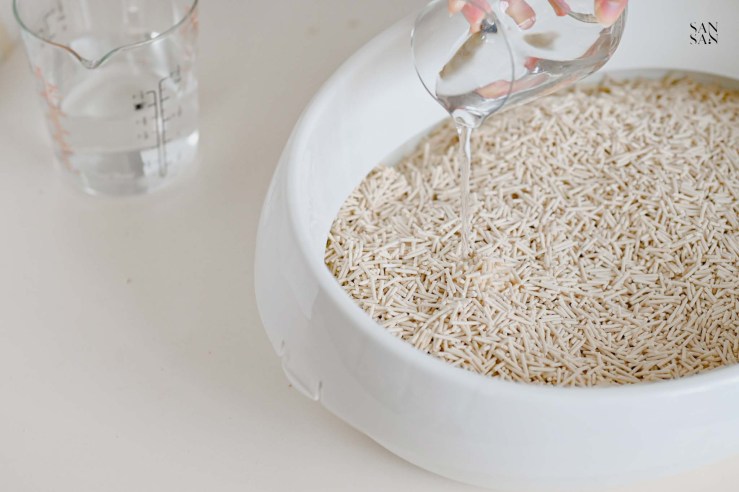 ▲ 汪喵星球(玻璃碗中) vs 水魔素(貓砂盆中),水魔素1.5mm極細條狀豆腐砂,對貓掌友善,踩起來更舒適。