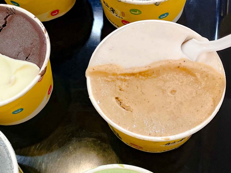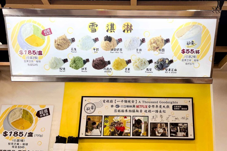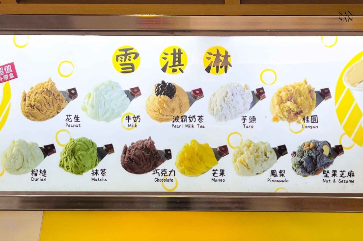 雪淇淋的口味眾多,除了水果口味和傳統口味外,還有創意組合,共有11種口味:花生、牛奶、波霸奶茶、芋頭、桂圓、榴槤、抹茶、巧克力、芒果、鳳梨和堅果芝麻。