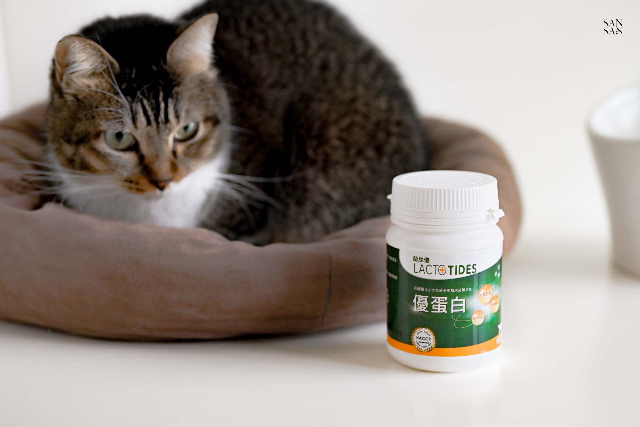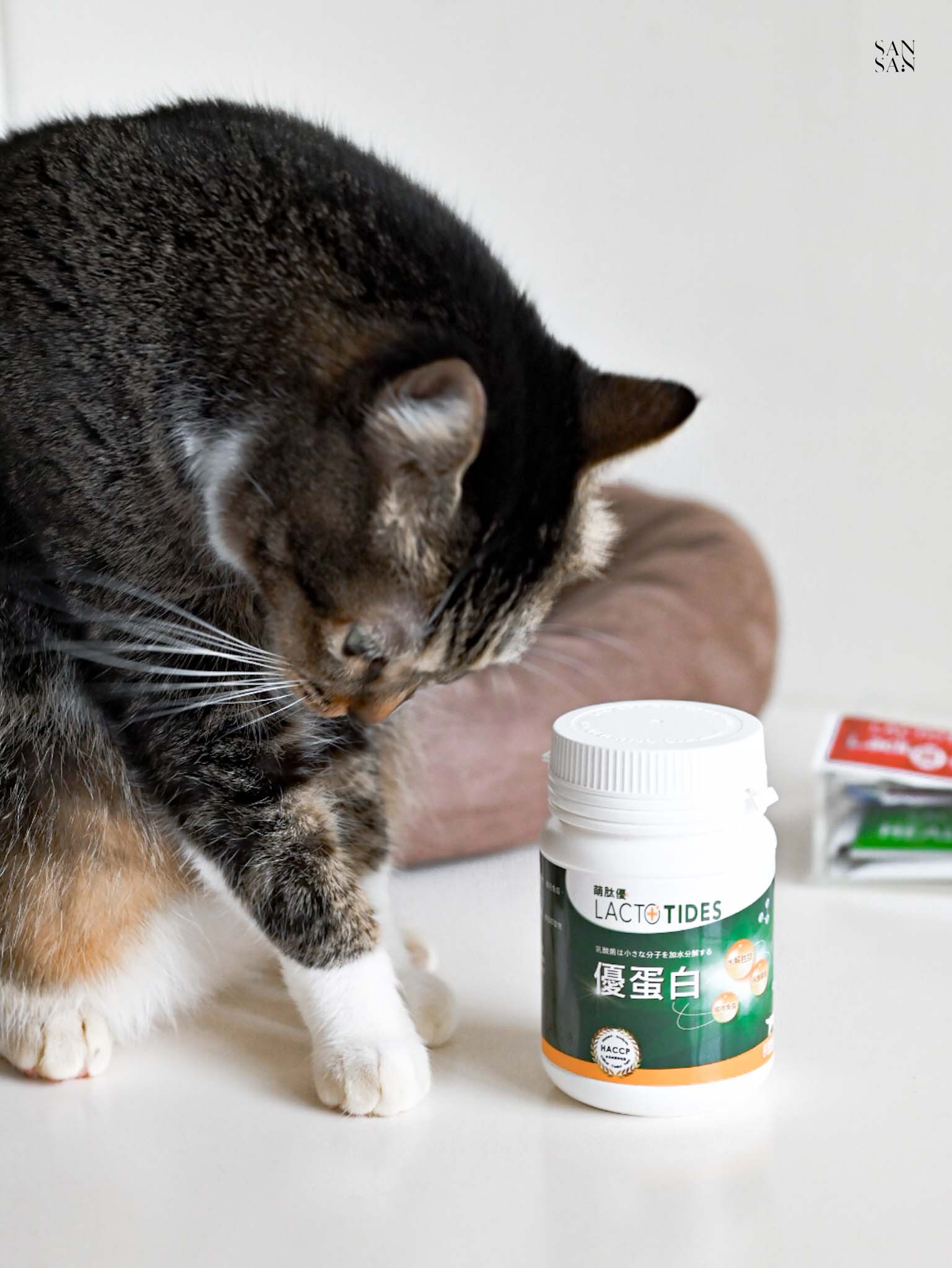 身為貓奴,真的每天都在想怎麼讓Eko主子過得更好,除了挑選安心的飼料和罐頭,有時候還會補充營養品作為日常保養,主要是寵物益生菌或泌尿相關的保健品。最近sansan發現一款主打「多元蛋白補充+後生元保健」的營養品——【萌肽優 LactoTides 全護型優蛋白】,替毛孩的肌肉、皮膚、關節、免疫等全方位保養,適合懷孕、術後及高齡的毛孩。由於運動關係有在喝高蛋白的sansan,立刻好奇的來試看看「給寵物的高蛋白」~