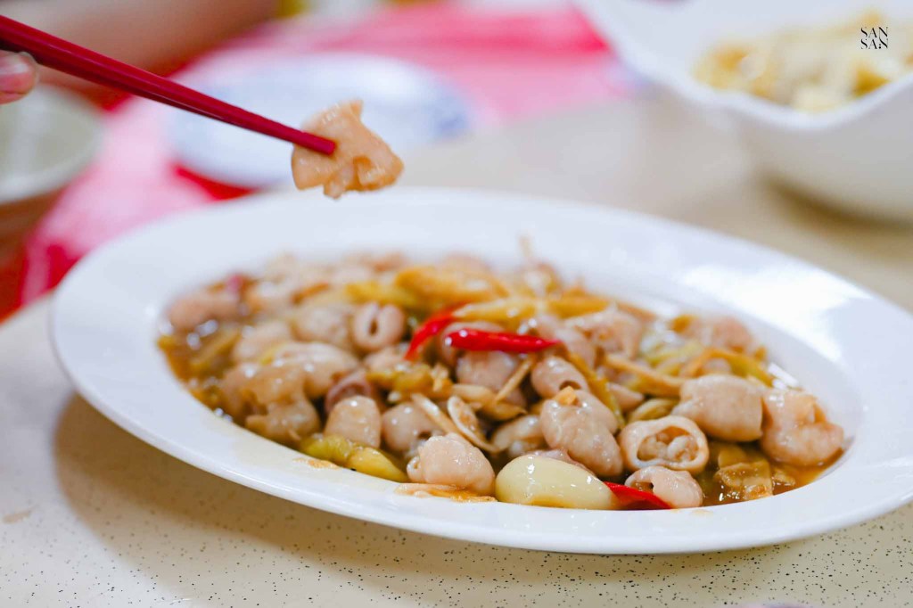 豆干、豬肉、魷魚、蔥蒜大火快炒,香氣四溢,鹹香帶勁,很快就被掃光了!還讓人齒頰留香、一猶未盡~