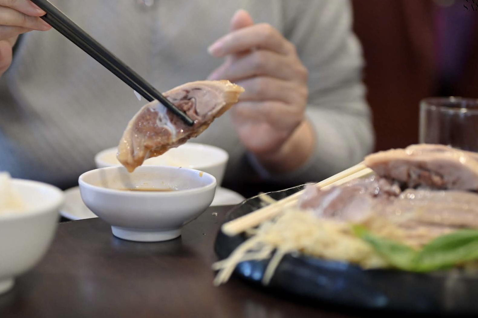 鵝腿的肉質很嫩,外皮Q彈、脂香不膩。原味就很美味,但沾上店家特製醬汁,微鹹微甜的滋味更是豐富。也難怪他們可以靠這一味聲名遠播呀!