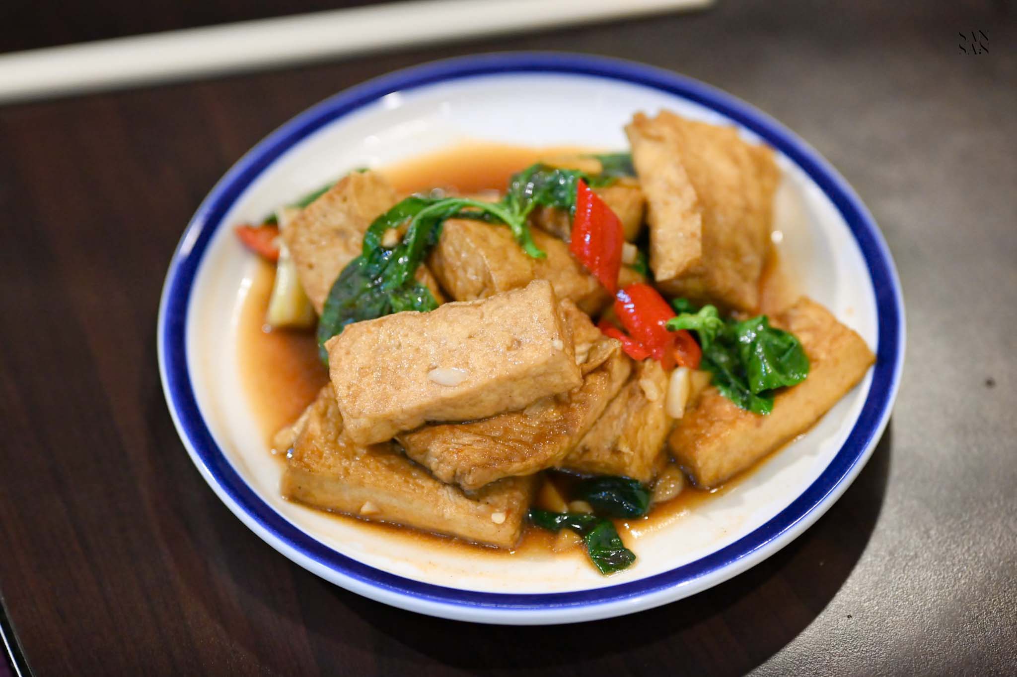煎過的厚切豆腐,淋上鹹香的醬汁提味,但整體來說味道太淡。