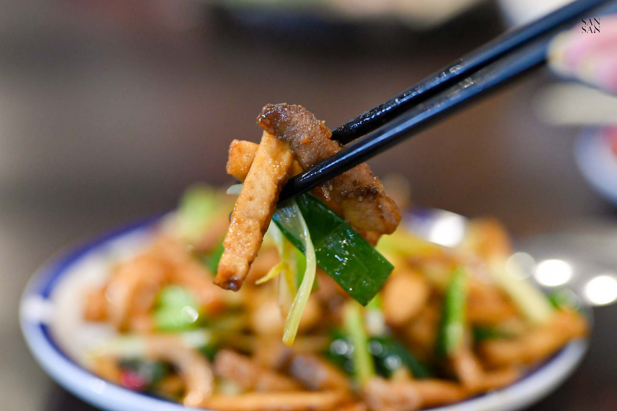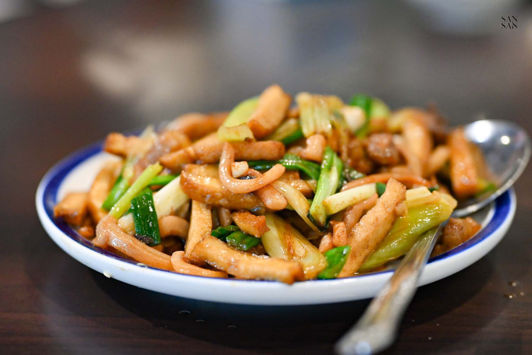 食材包含五花肉、魷魚、豆干與蔥段,厚切能很好的保留不同食材的豐富口感,且炒得又香又夠味,鹹香中帶點微辣,特別好吃~
