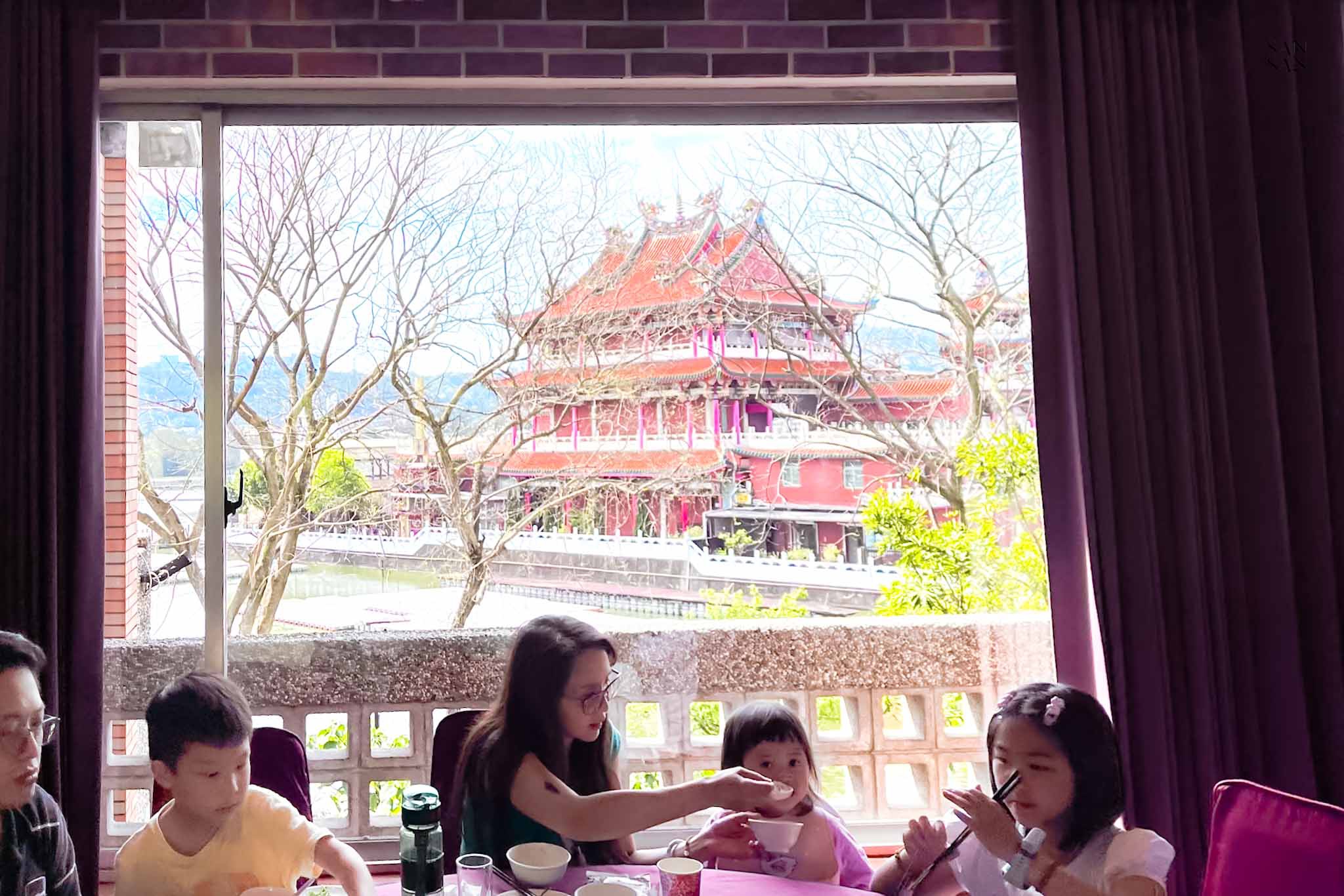 ▲ 二樓靠窗座位區的風景超好!可以一飽湖邊的桃園龍潭南天宮風光。