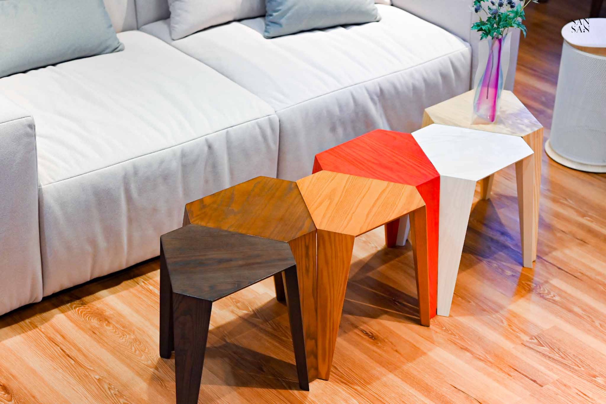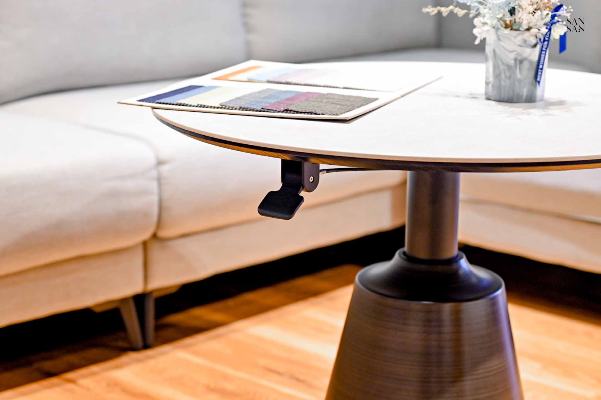 現場有多樣的茶几樣式,不論是高級摩登的大理石方桌、溫潤沉穩的原木矮桌、極簡北歐風的蛋形桌等,還有超實用的升降桌茶几(下圖二)。