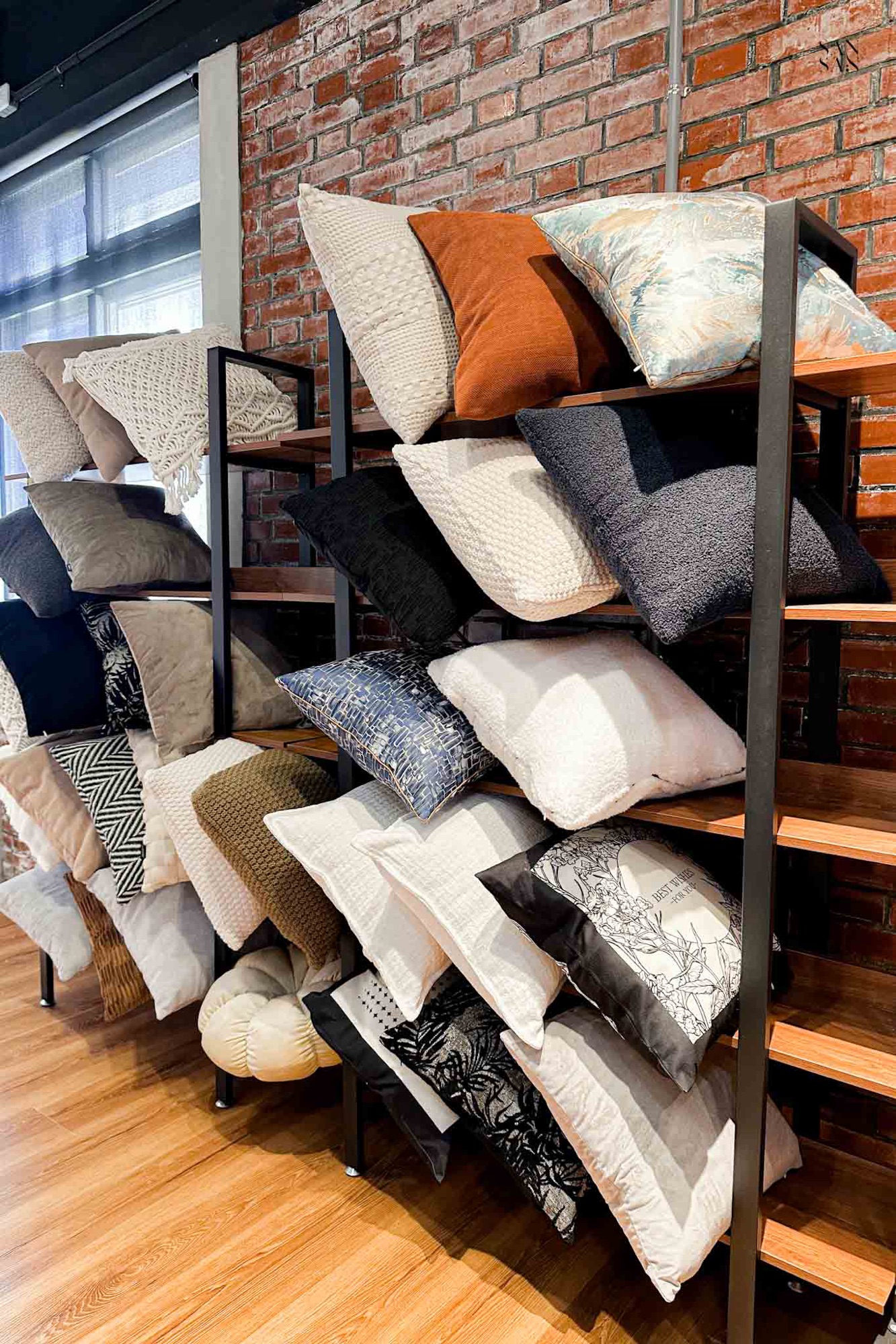 二、三樓展示間有沙發、茶几、床墊、床架、床頭櫃等展示,另外還有各式花樣、材質的抱枕可以自由搭配。
