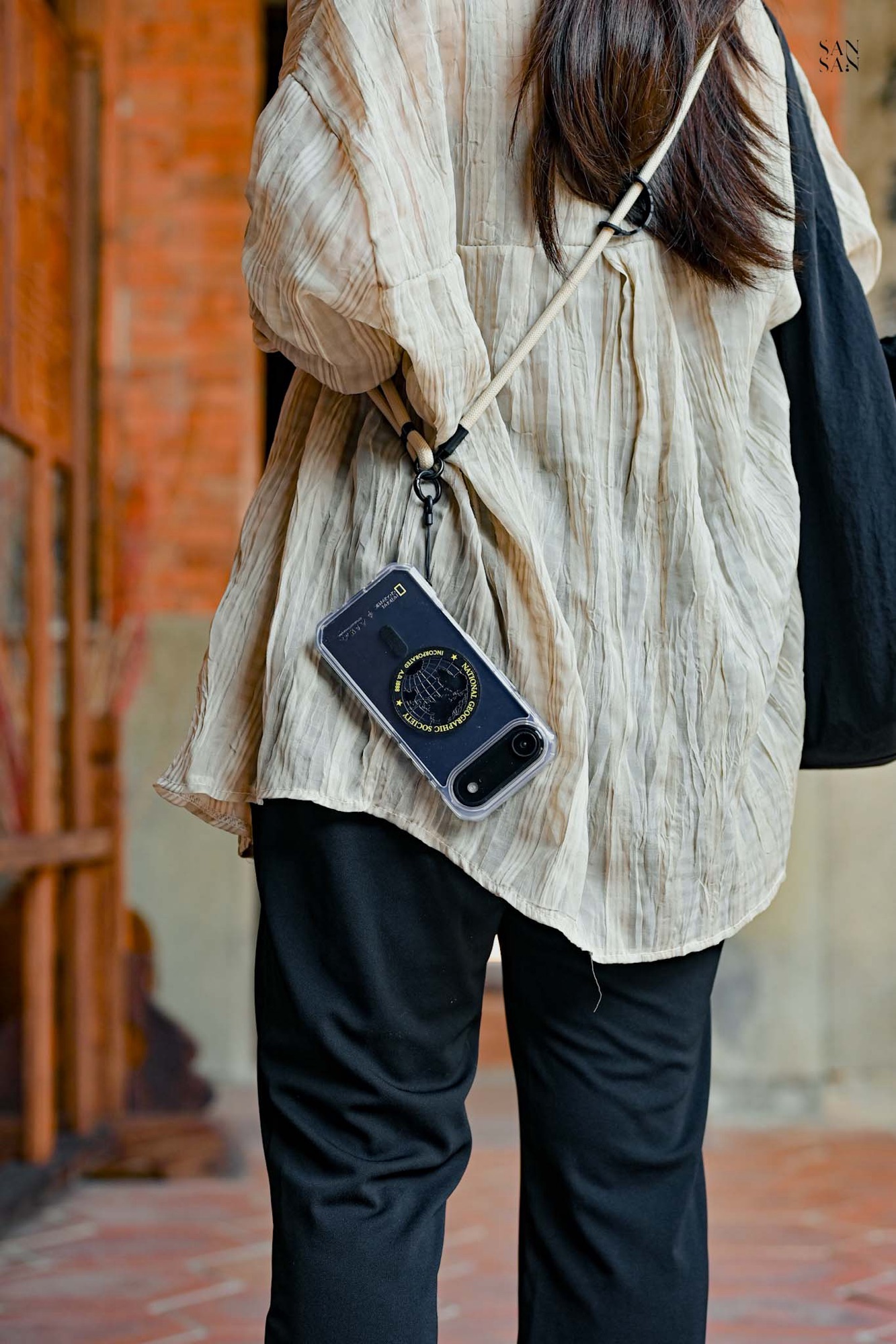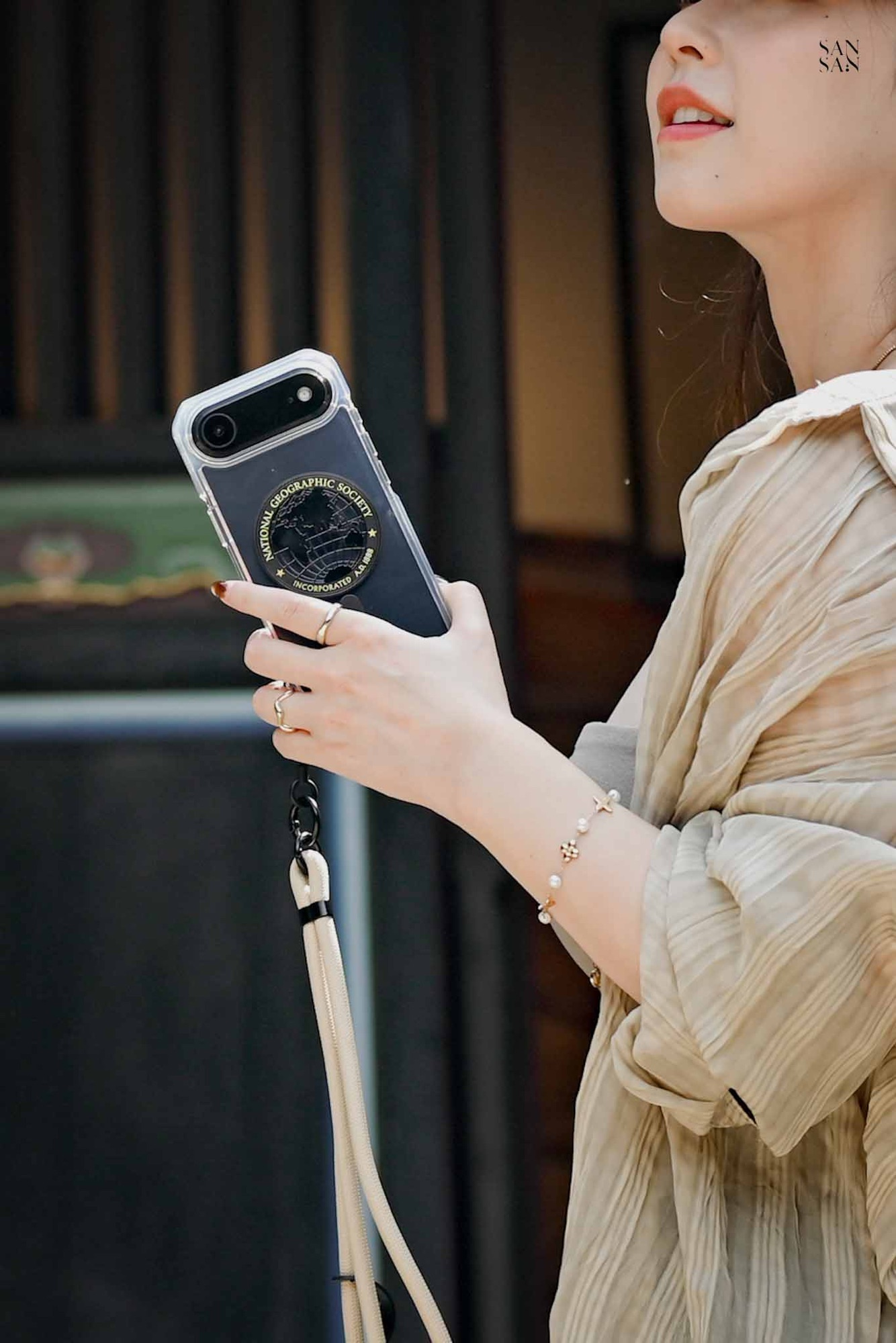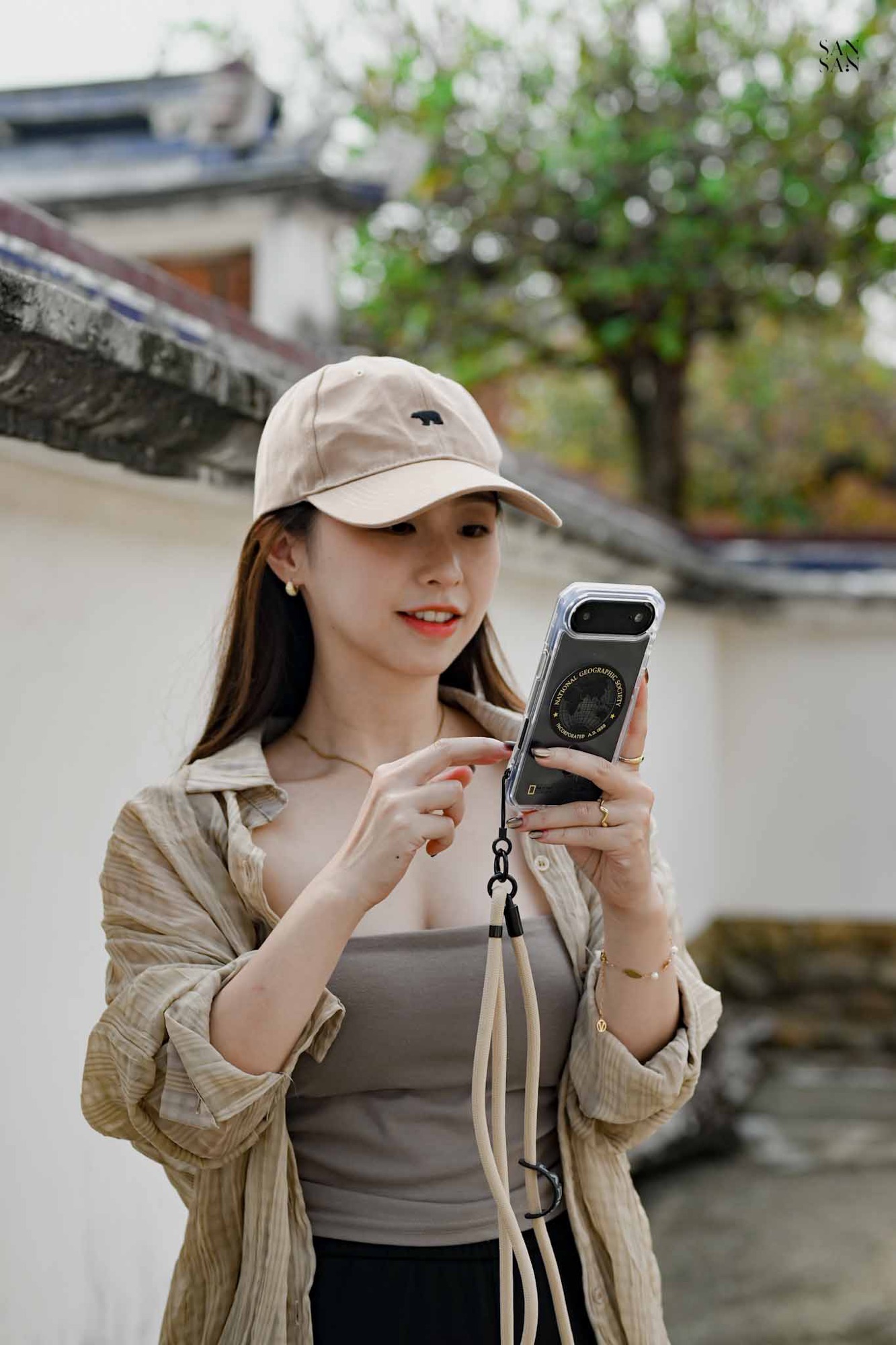 殼身側邊貼心保留了鑰匙圈孔,可以依穿搭或喜好,加上掛繩或小吊飾,展現個人風格。對於喜歡外出攝影的sansan來說,手機掛繩是最方便的我雙手持相機拍照的法寶。